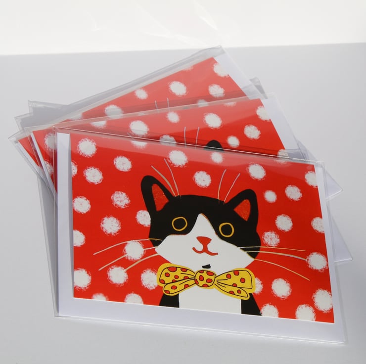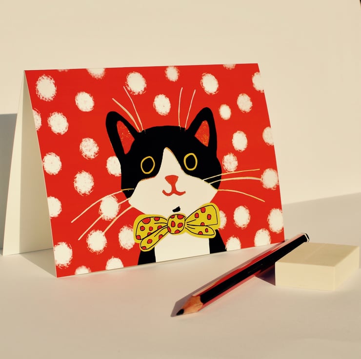 This A6 card is a smashing reproduction of one of my linocuts of a cheerful little black and white cat that I have enhanced digitally to add some even cuter features. Perfect for the cat lover in your life, the card comes with a pristine white envelope, packed in a cello bag.
