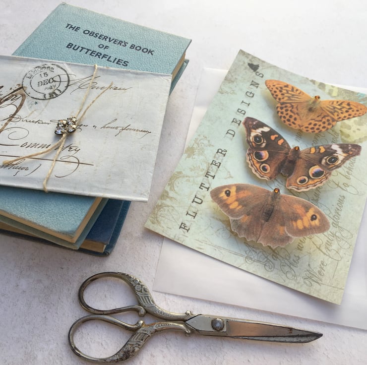 This listing is for a set of 3 Butterfly clips, they will be sent presented on vintage style postcards, tucked into vellum envelopes and tied with satin ribbon.