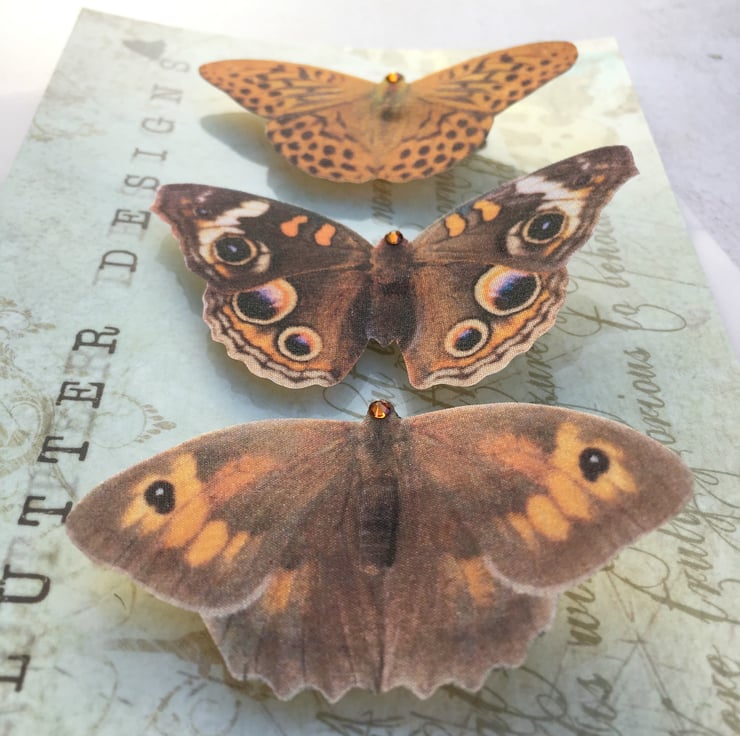 A beautiful set of three beautiful brown silk butterfly hair clips, each one carefully hand cut and sent presented on a pretty gift card. You are purchasing the set of three in the first image!