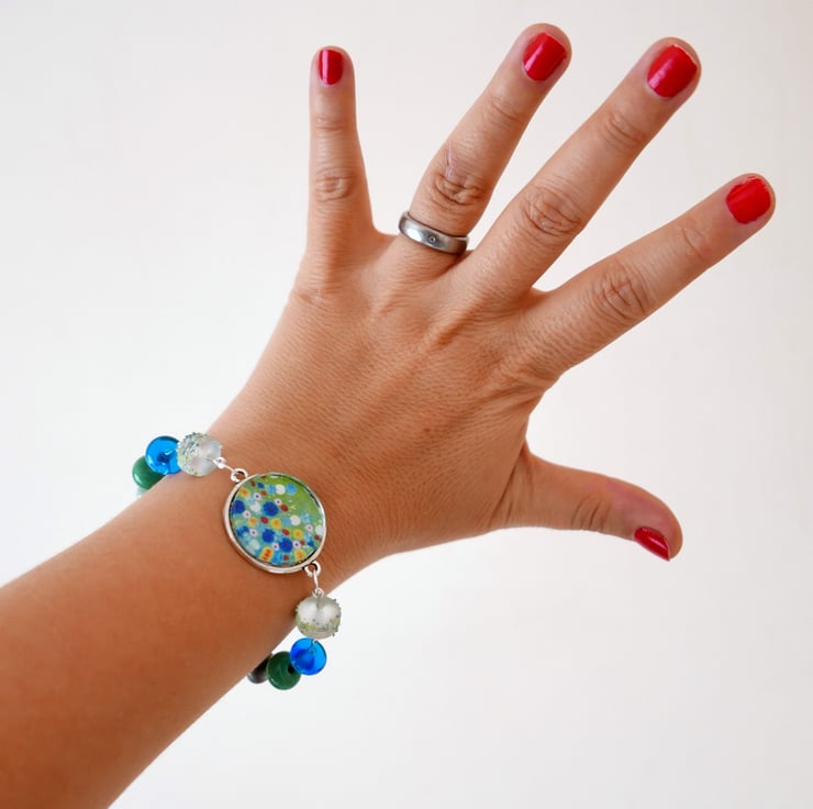 I made this bracelet using a 1" round floral art pendant connector featuring a print after one of my original meadow paintings available in my shop. I also used various colours of lampwork beads to compliment the colours and the style of the pendant - two green transparent with a sea glass effect, two blue, two green, two grey-green and two green faceted glass beads.