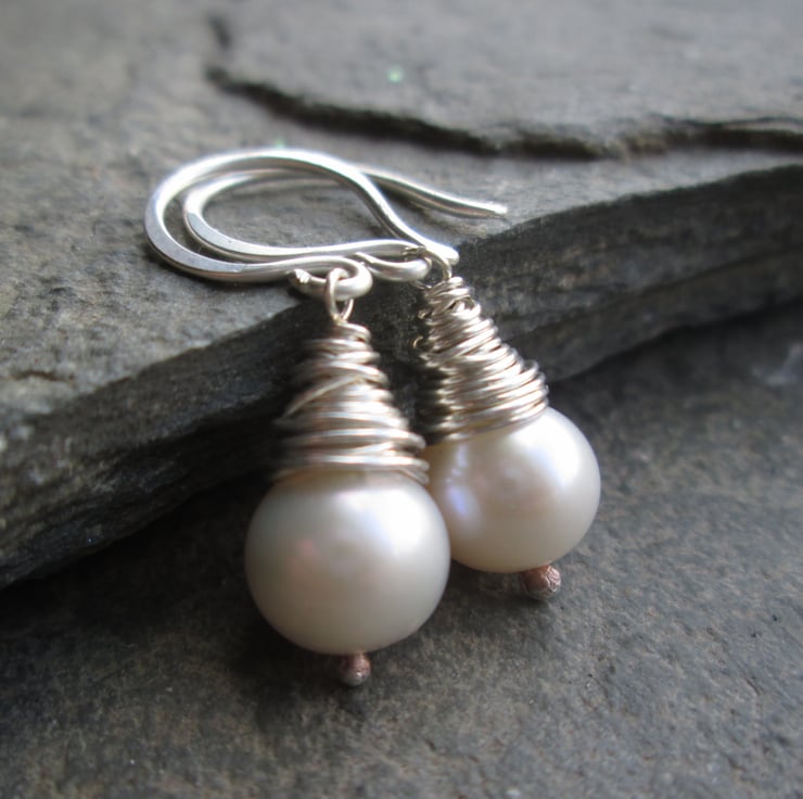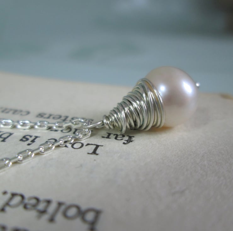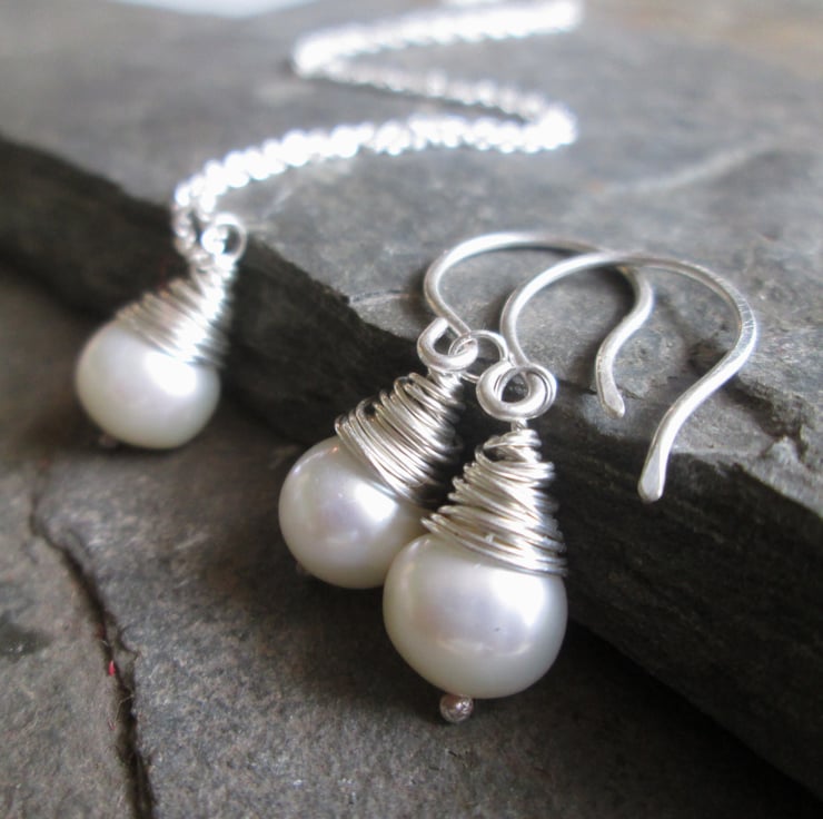 Freshwater pearls (8mm) in a soft ivory tone hang delicately from a sterling silver chain and handcrafted ear hooks to create this classic pearl jewellery set. Each pearl is hand wrapped in wire to create a classic teardrop shape. An elegant and timeless set that is sure to become a staple accessory, suitable for everyday and occasion wear. Each piece is handmade to order, and due to the free form nature of wire wrapping, every one is unique.