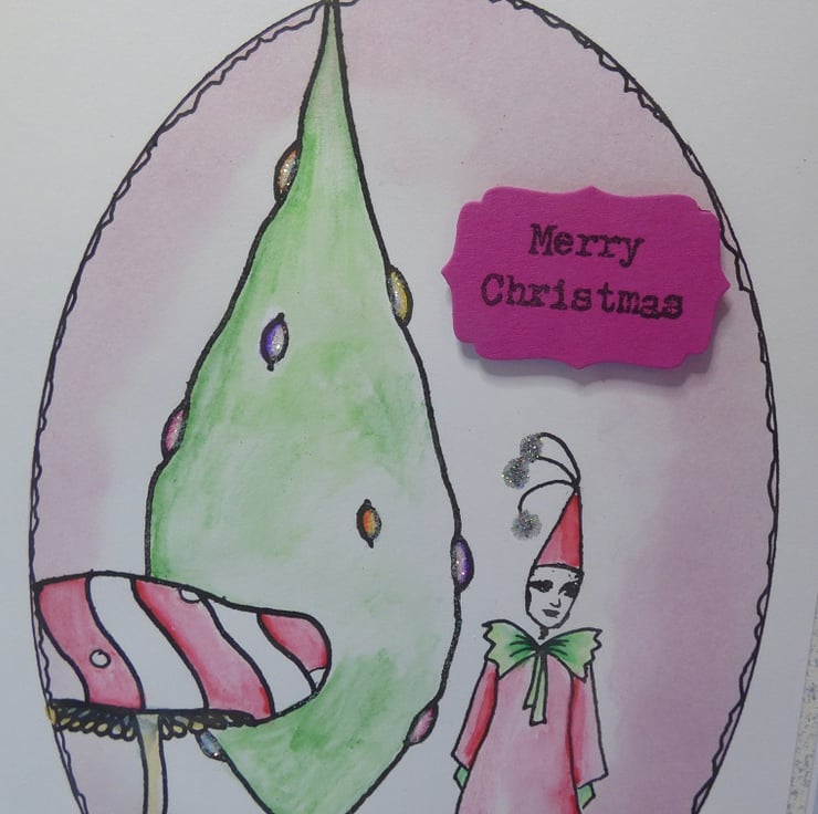 Using these images I created a Christmas image with Willow the clown in a land of make believe. She stands in front of a squashy Christmas tree with inset baubles, and a stripey toadstool, surrounded by gifts and a shooting star in the sky.
