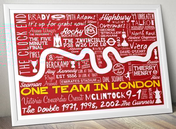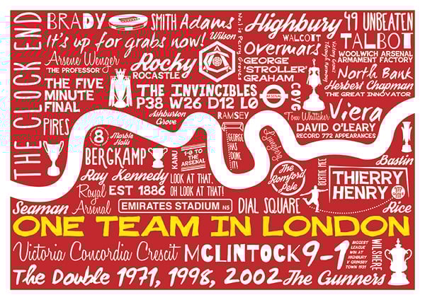 I am producing a set of posters of great football teams in major cities beginning with London. This poster celebrates everything Arsenal! From famous players to terrace chants, its all here to hang upon your wall.