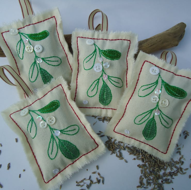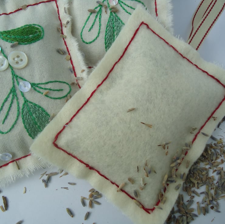 The mistletoe motif has been hand-stitched in embroidery silks and embellished with sequin and button ‘berries’ onto a natural, unbleached calico, backed with a soft cream felt and lightly filled with dried lavender. The beautiful scent of lavender makes this sachet a perfect addition to any doorknob, bedstead or cupboard handle, or pop into a drawer or wardrobe to add a subtle scent to clothing.