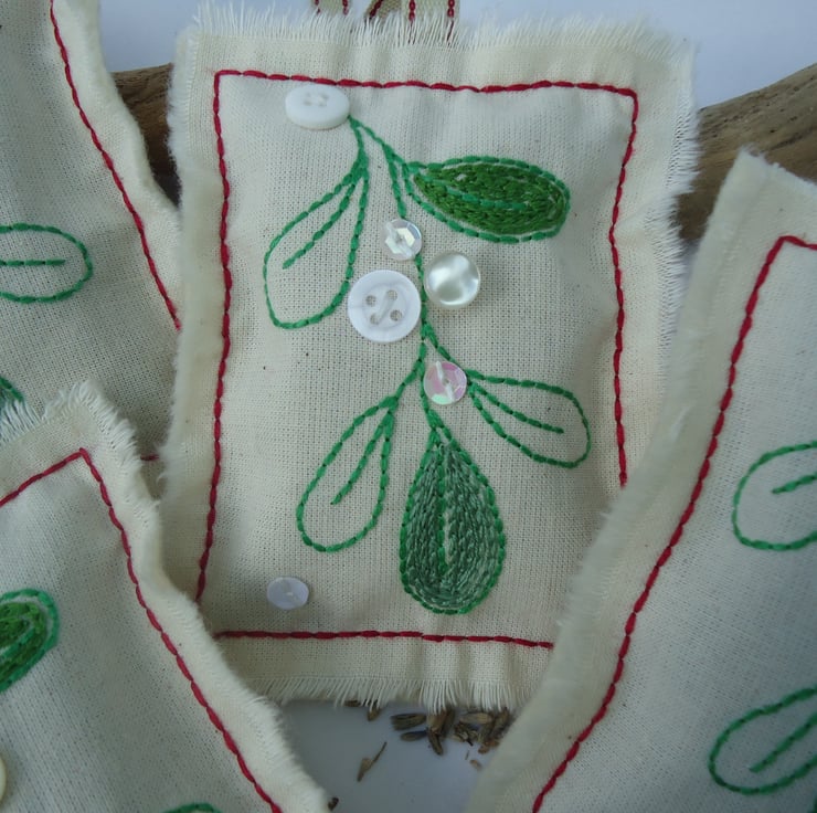 The mistletoe motif has been hand-stitched in embroidery silks and embellished with sequin and button ‘berries’ onto a natural, unbleached calico, backed with a soft cream felt and lightly filled with dried lavender. The beautiful scent of lavender makes this sachet a perfect addition to any doorknob, bedstead or cupboard handle, or pop into a drawer or wardrobe to add a subtle scent to clothing.