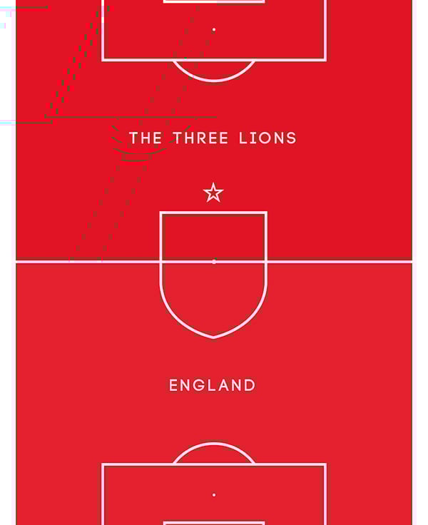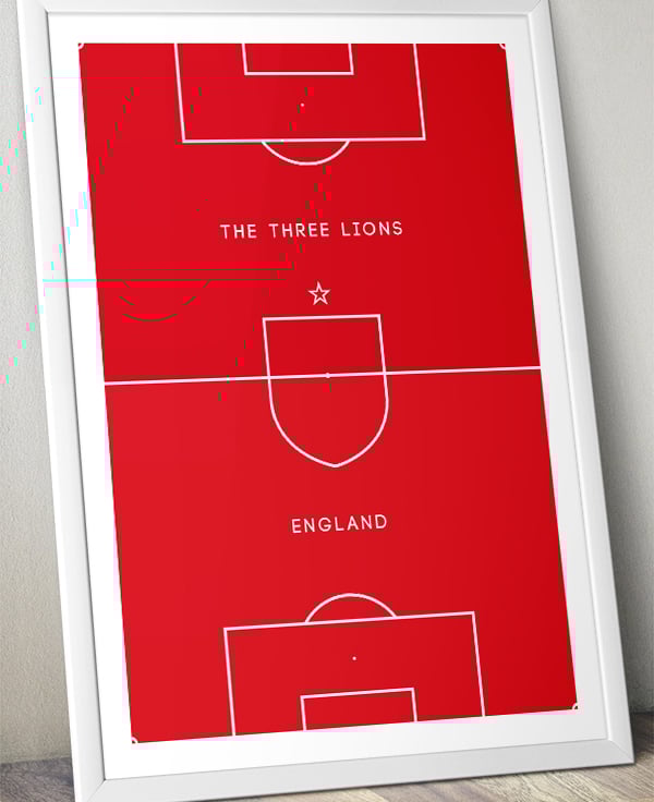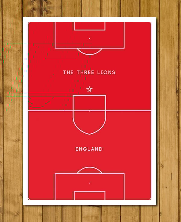 The ‘Pitch Perfect’ poster collection celebrates world famous football club colours, badges and mottos. This edition depicts the international team badge of the England.