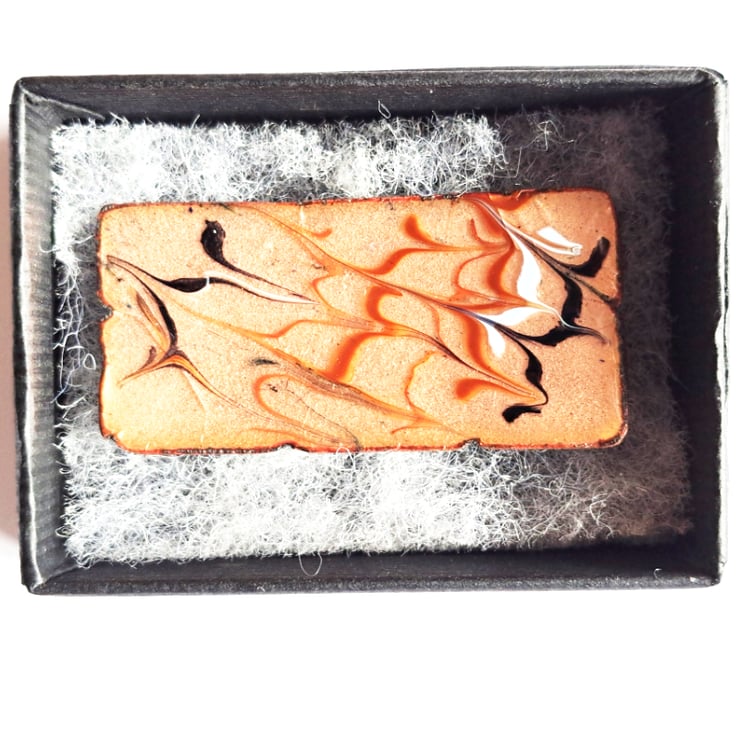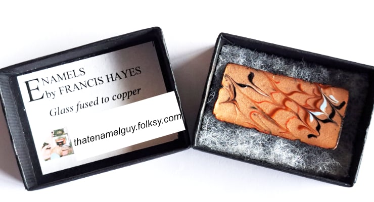After building up a base coat of several layers of clear enamel on the copper rectangle I fired rods of red, red-brown, pale blue and black enamel over it then drew through the rods to create the scrolled pattern,