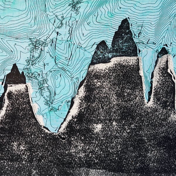 This mountain map print is based upon a graph of a walk in the Dark Peak, North of the Peak District. The Y axis represents the heights of the peaks, the X axis the distance walked. The technique is a mixture of collage of maps of the area & linocut printmaking, produced as a limited edition (30) signed giclee print.