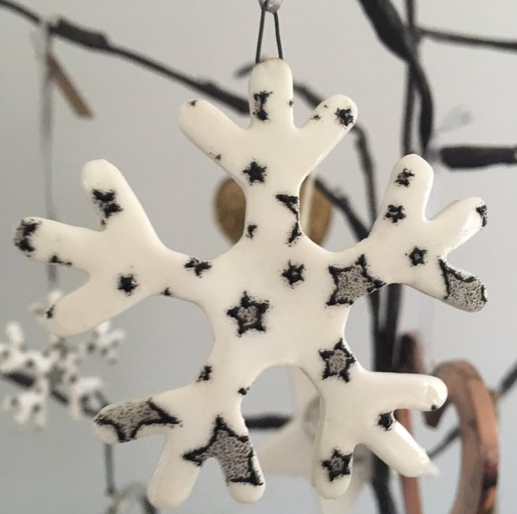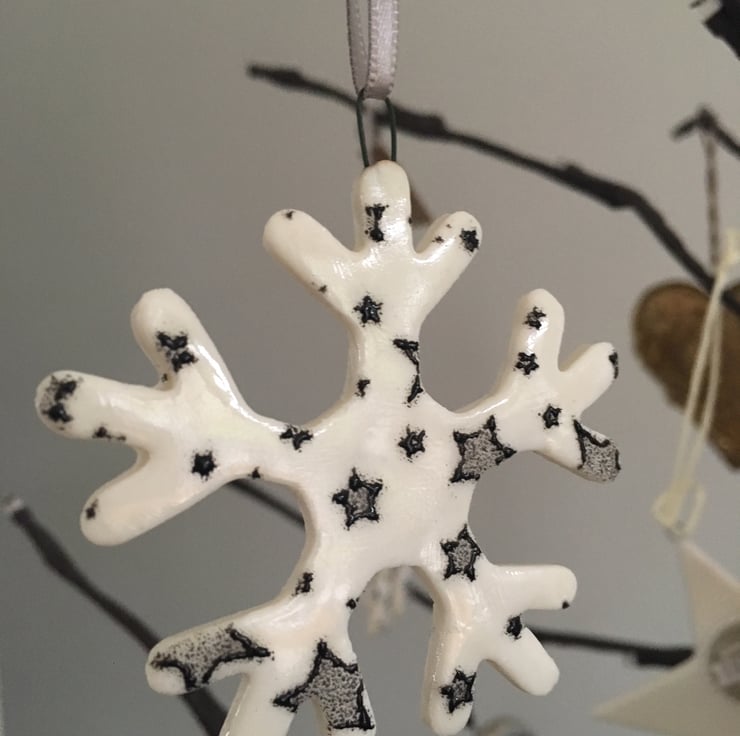 A beautiful porcelain snowflake with graphite embossed star pattern
