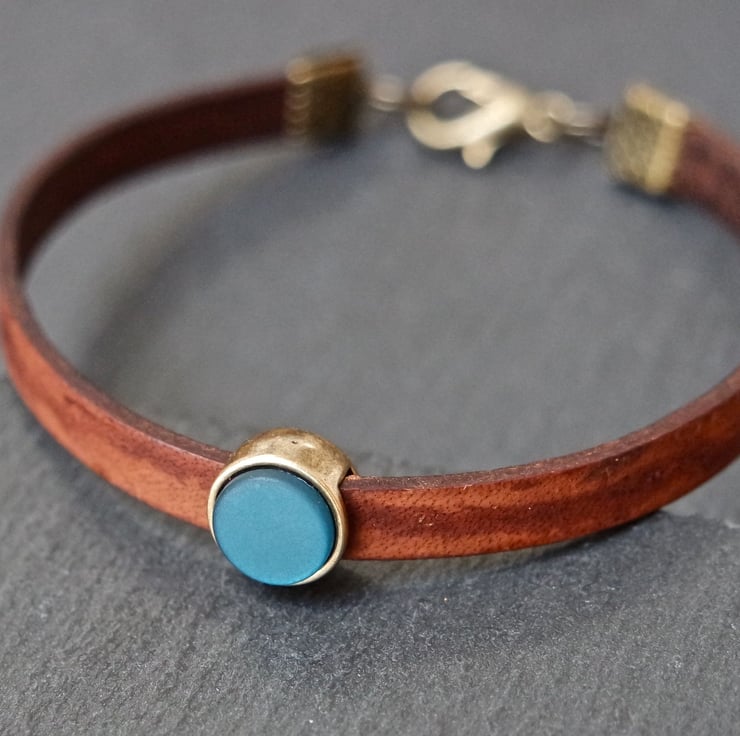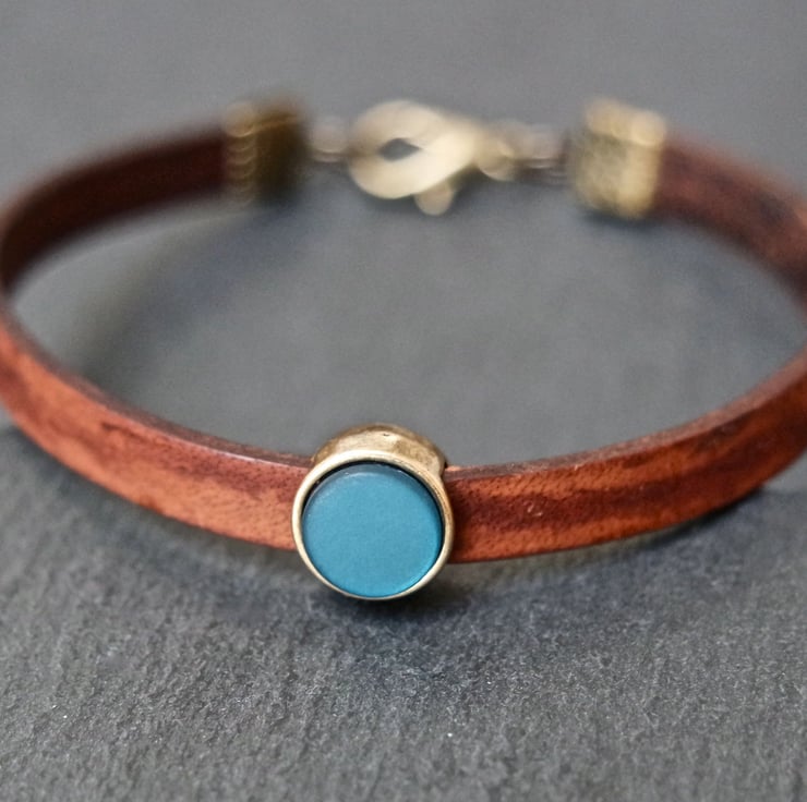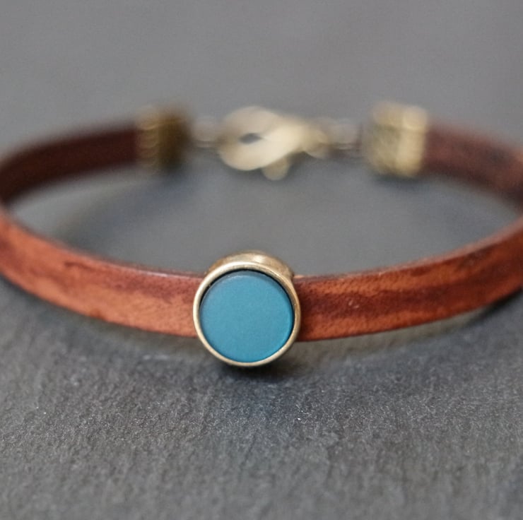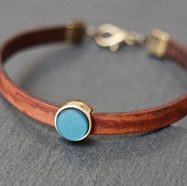 A lovely dark brown leather bracelet with a small teal and antique gold bead as the focal point. The cabochon is matt with a magical sheen to it.