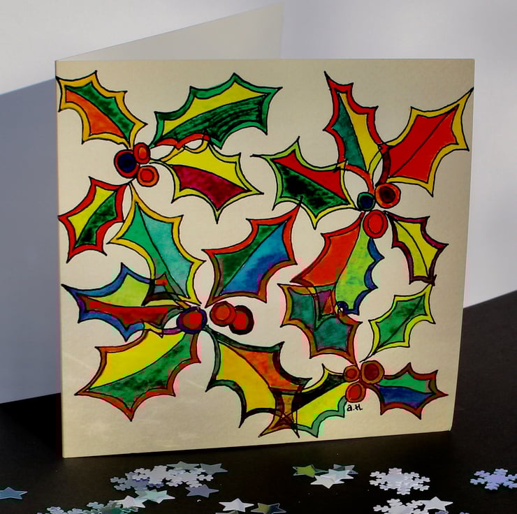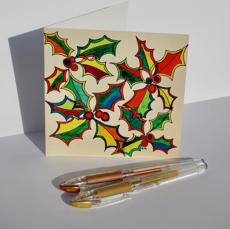 This 135mm square card is a great seasonal greetings card depicting holly my way! Outlined in ink, I filled in the design with some great watercolour shades to give it my magic touch!