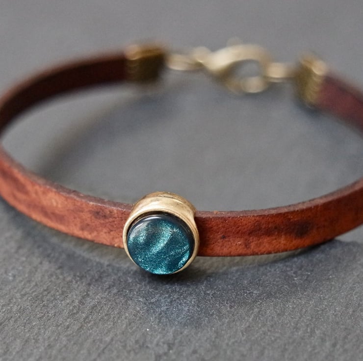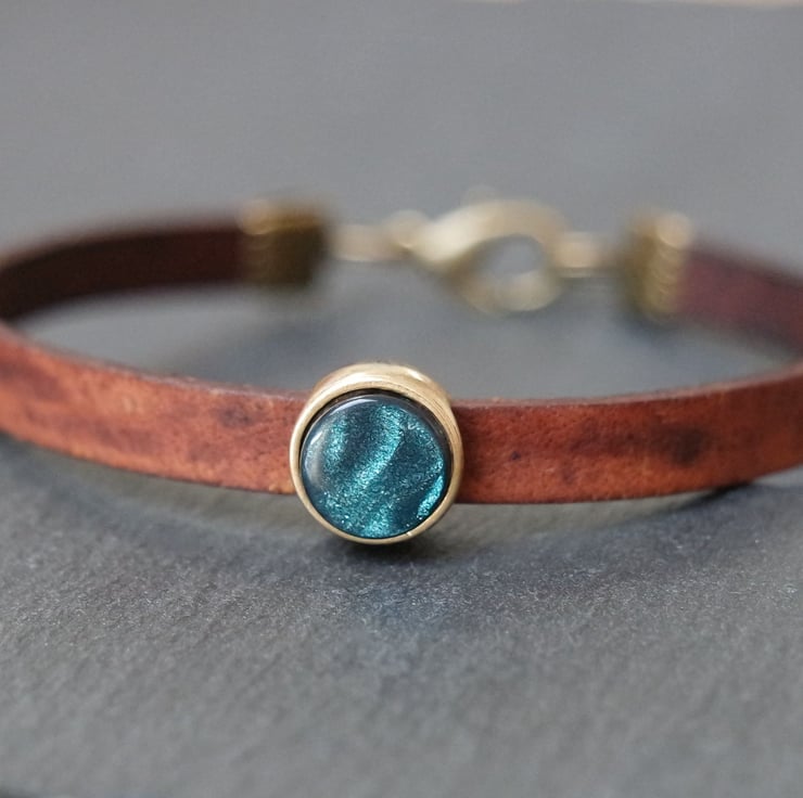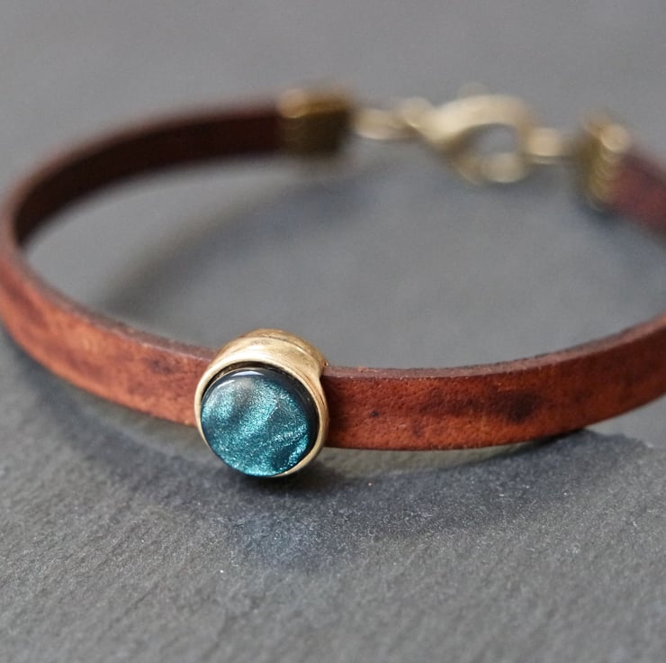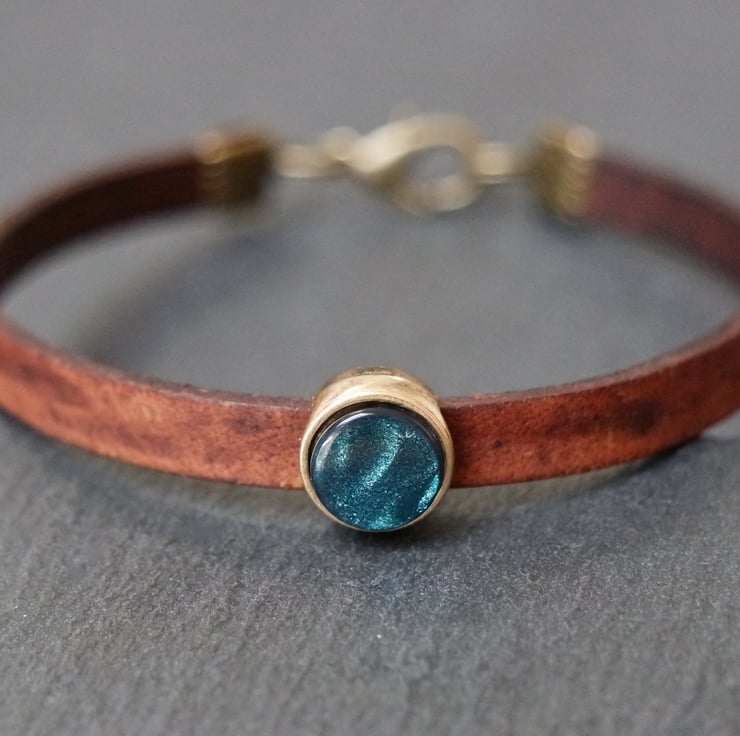 A lovely dark brown leather bracelet with a small shimmering teal cabochon in an antique gold setting. The cabochon has glittering swirls with a magical sheen to it.