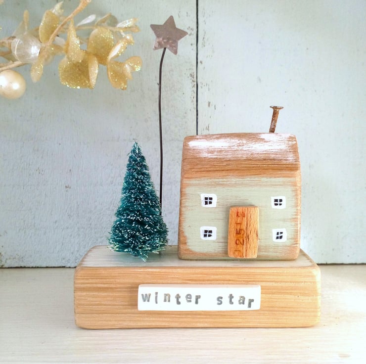 This little hand-painted oak wood house has a snowy tree in the garden and a shining star overhead.