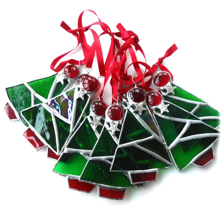 They are cut from 4 different types and shades of green glass, have a red bauble on top and a red pot at the base They also have a silver star soldered under the red bauble.