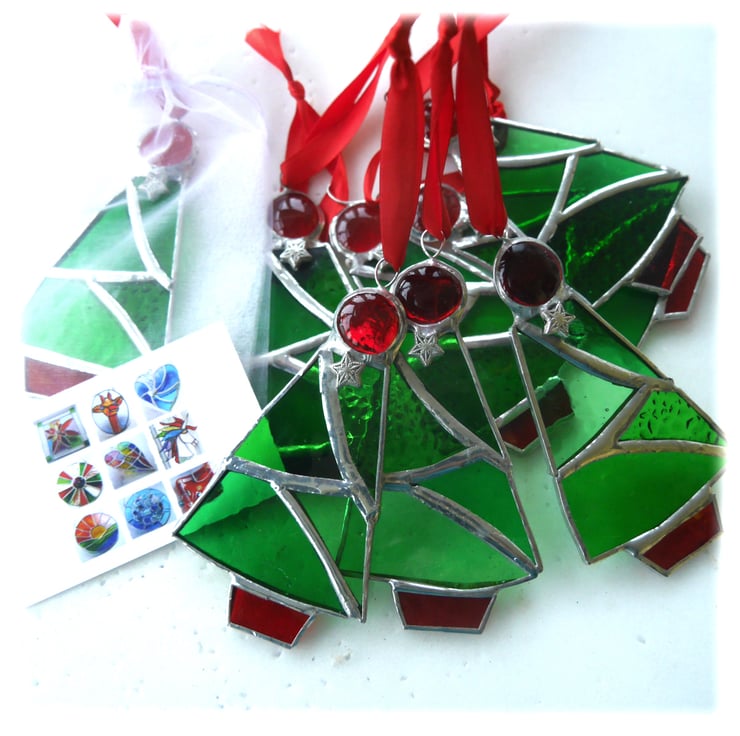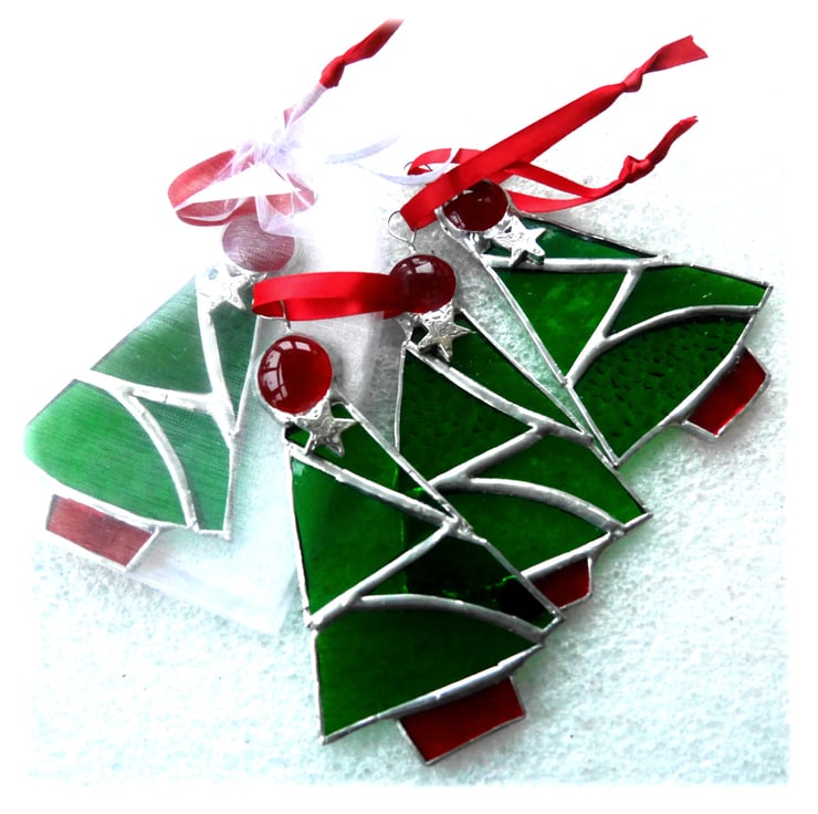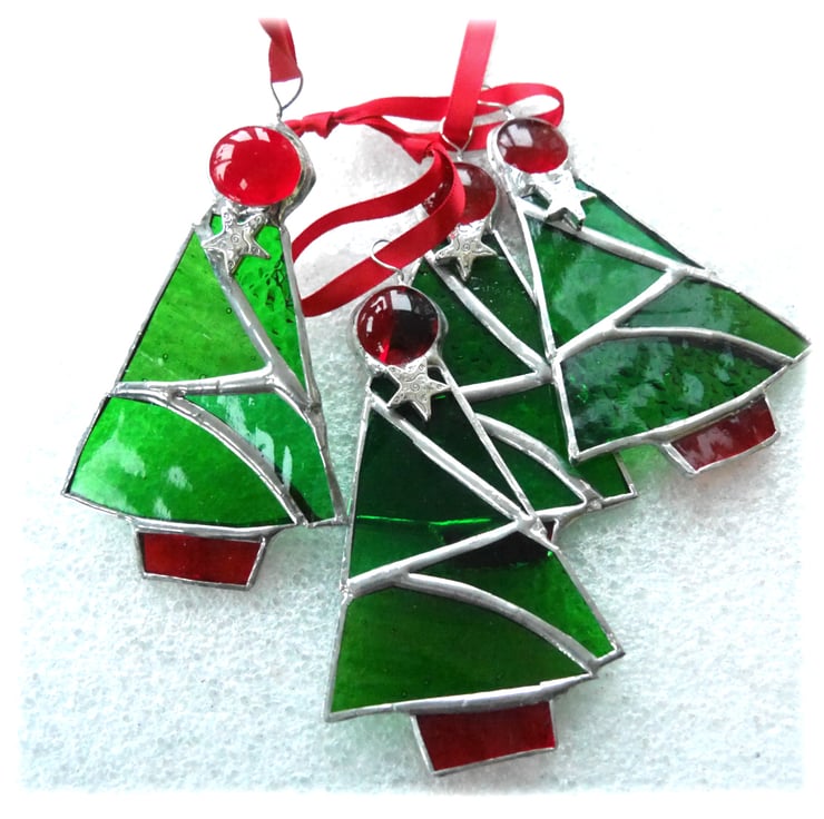 They are cut from 4 different types and shades of green glass, have a red bauble on top and a red pot at the base They also have a silver star soldered under the red bauble.