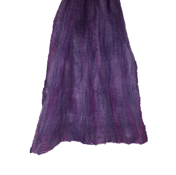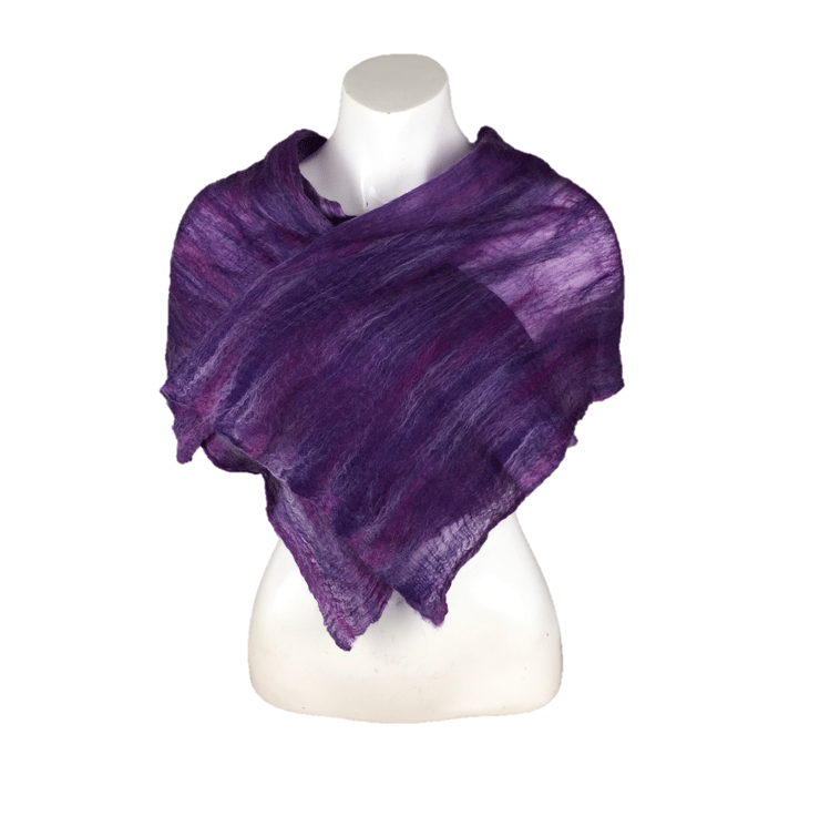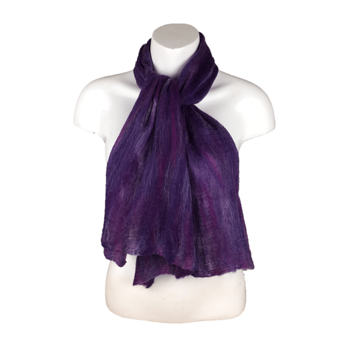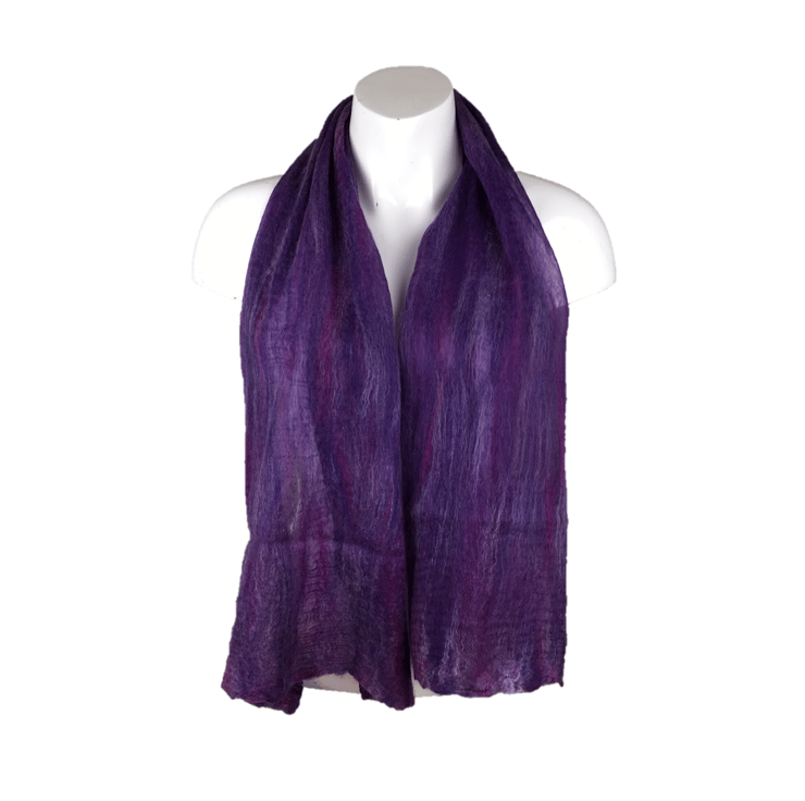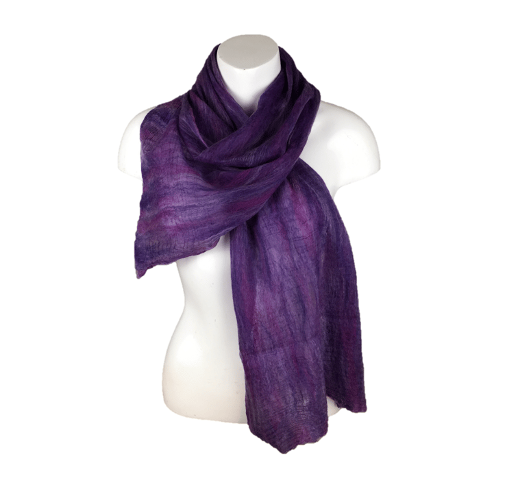 Soft and warm but still lightweight and floaty, this amazing scarf has been nuno felted using a blend of purple shades of merino wool on a deep purple silk chiffon fabric. The nuno felting process causes the woollen fibres to migrate through the silk and bind with it. The scarf is felted on both sides.