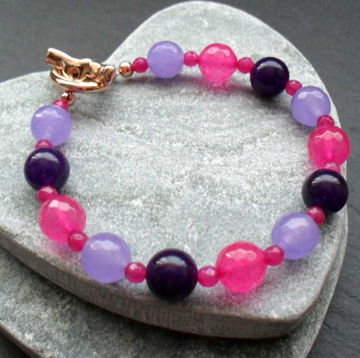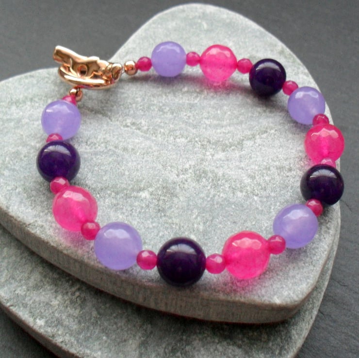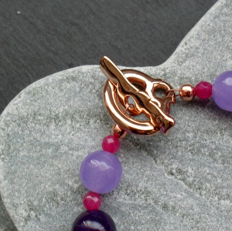 Lilac Fuchsia and purple dyed quartz beads are beaded on to beading thread and attached to a good quality rose gold plated toggle clasp.