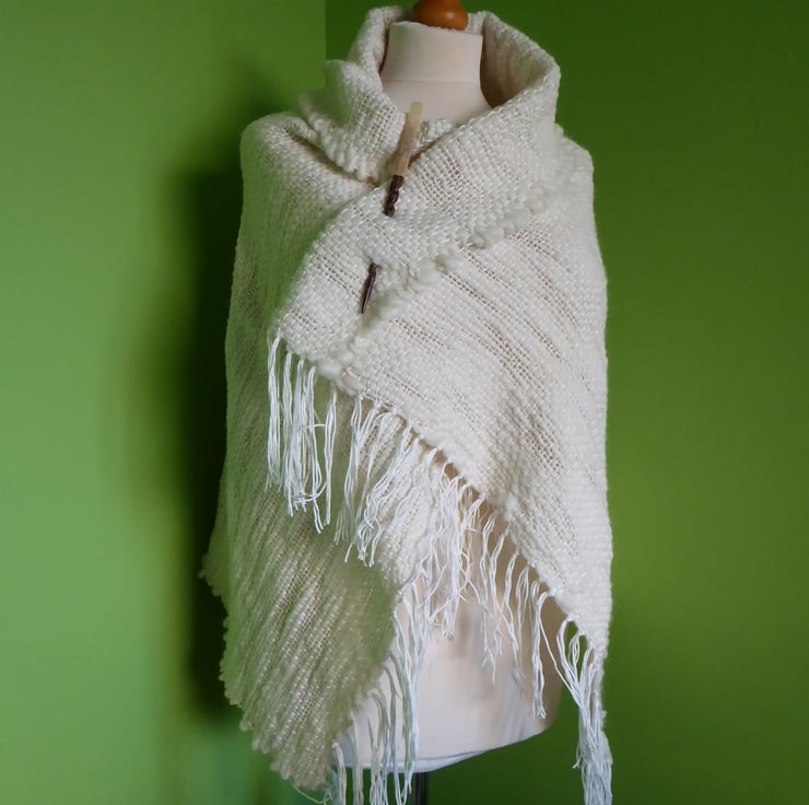 This wonderful shawl has been hand woven on my rigid heddle loom. The warp is a luxury 100% cotton yarn, and the weft is a super chunky slub Falklands pure wool top. The slub yarn gives texture and movement to the wrap.