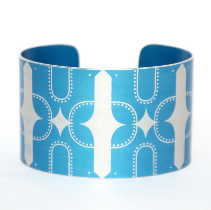 A striking bracelet/cuff made from anodised aluminium with a geometric bird design. I drew this pattern digitally, made it into a resist and applied it to the metal. I then dye the aluminium, seal it and remove the resist which leaves the pattern showing in the original colour of the metal. The cuff is then made using traditional metalworking techniques.