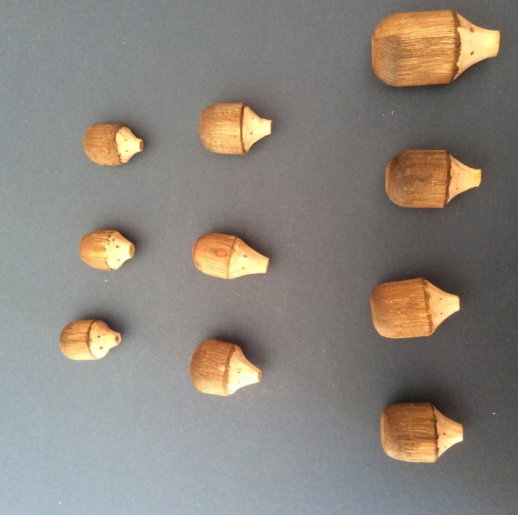Hedgehogs hand turned in sycamore, finished by hand and coloured with wood stain. The hole in the bottom means you can put them on a pencil or garden cane or just have them as an ornament. They range in size from 3-6cm and are all unique. When ordering please state if you prefer small, medium or large.