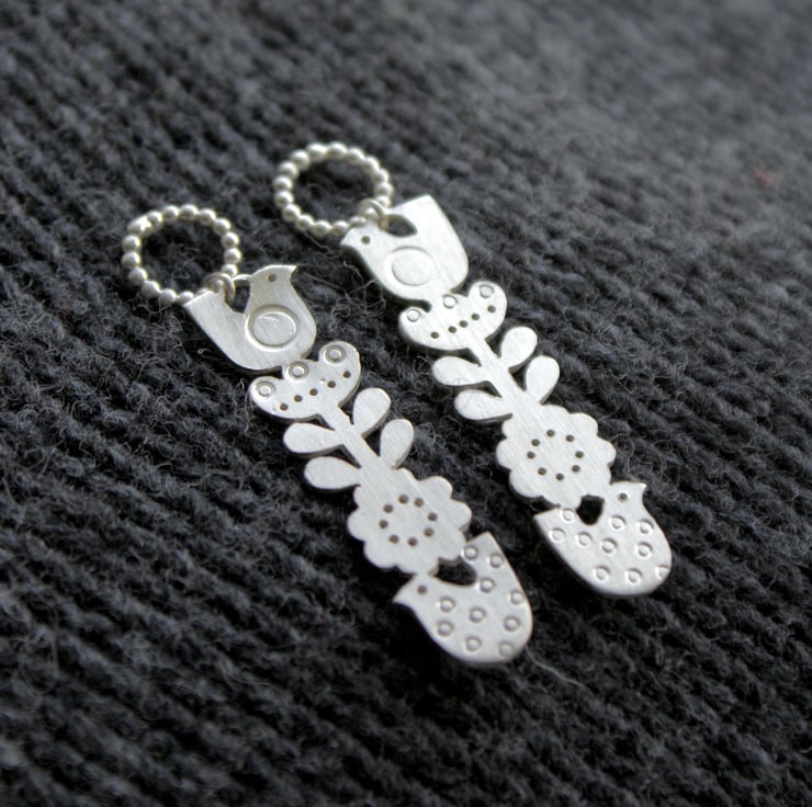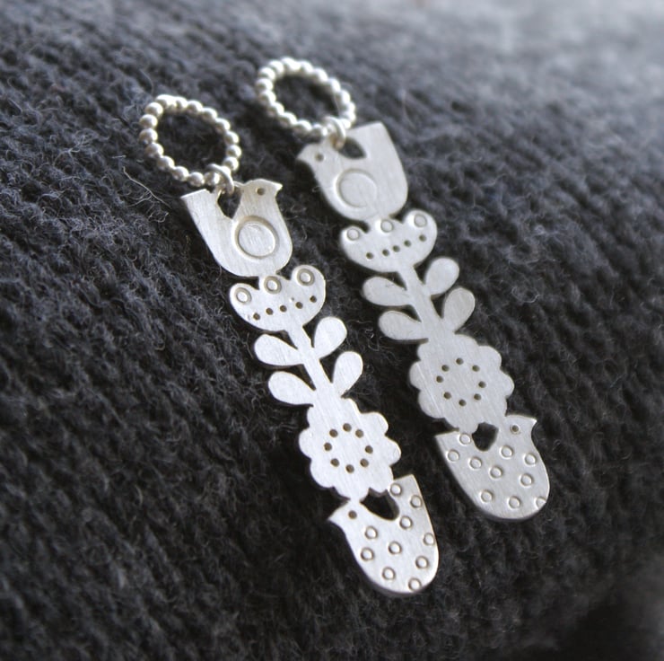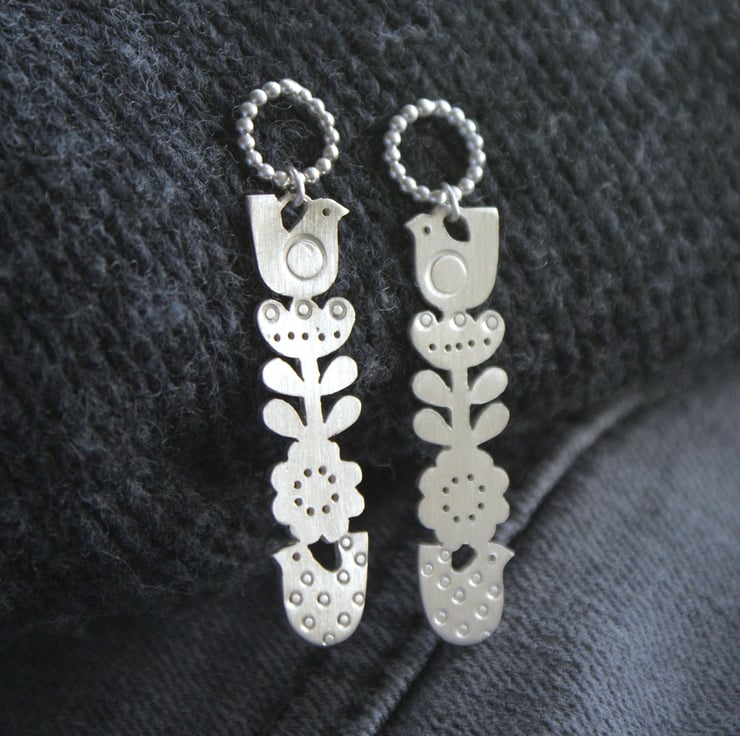 A fab pair of sterling silver dangly earrings hand made by me. The Scandinavian inspired design is completely hand cut and attached to a dotty circle stud. I have also added some circle patterns and tiny for texture. The finish is a satin silver. Please note each pair may vary very slightly from the image.