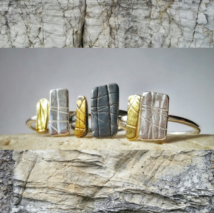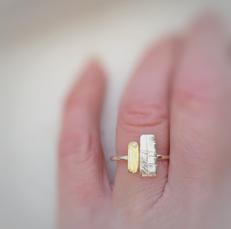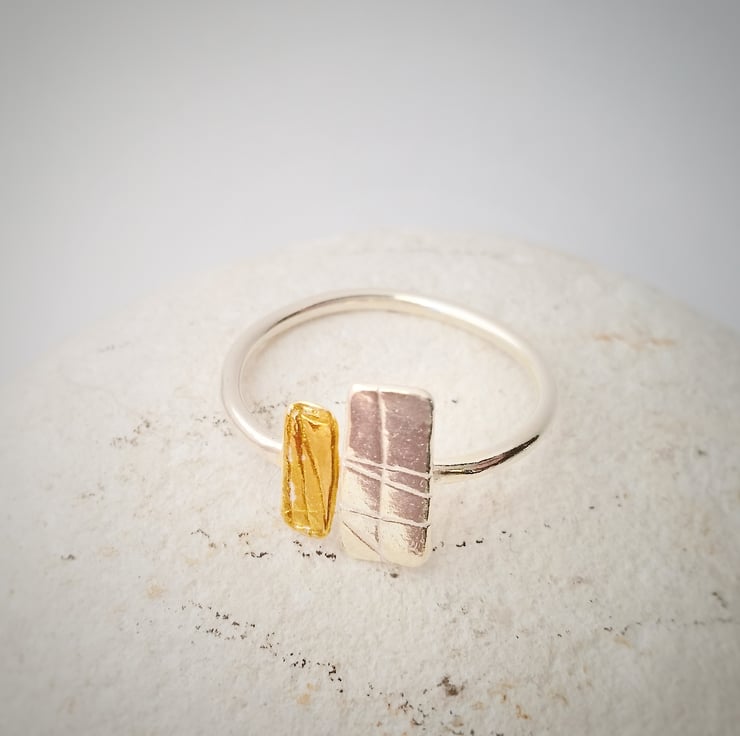 This is a really pretty unusual ring from my Tumbling Stones collection. The ring has a simple thin smooth shank with textured fine silver 'stones' at the front, one of which has been highlighted with 24ct. gold. The gap between the stones allows this ring to be adjustable from size N upwards. This dainty handmade ring has been inspired by the rocks of the Yorkshire landscape and its' quirky design makes it really eye catching and unusual.