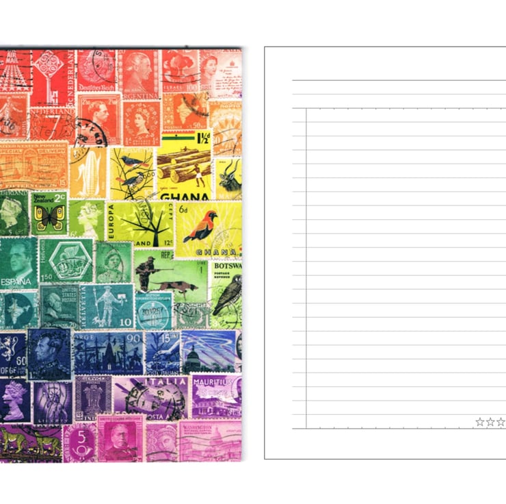 An A6 Pocket Notebook printed front & back with detail from one of my original postage stamp art collages in a full rainbow of colours. The layout of this pocket-sized, undated journal is great for keeping all your to-do lists and shopping lists organised, but the adaptable layout also lends itself to many more possible uses. The handy header space and 5 star review system make it a perfect portable book review journal, or travel notebook. It could even be used as a pocket bullet journal!