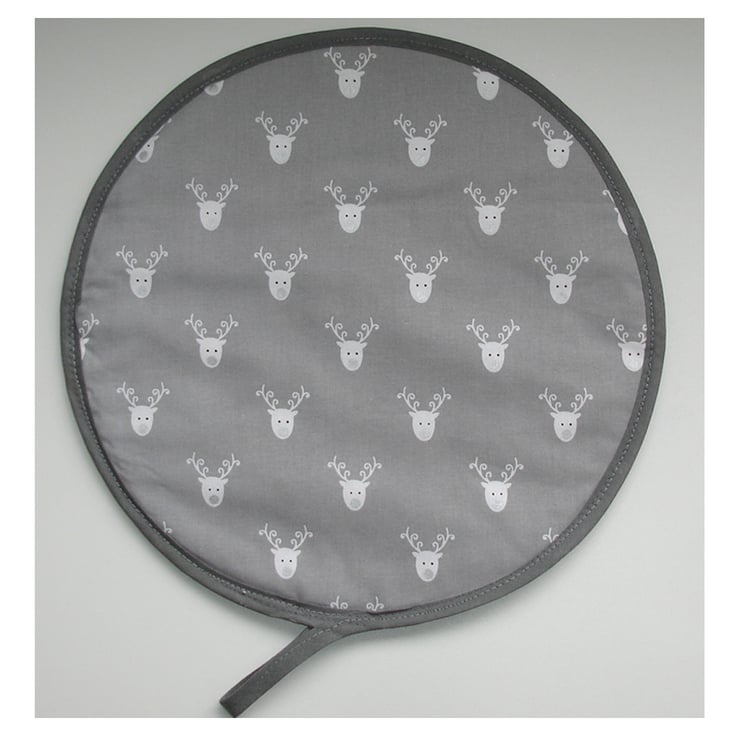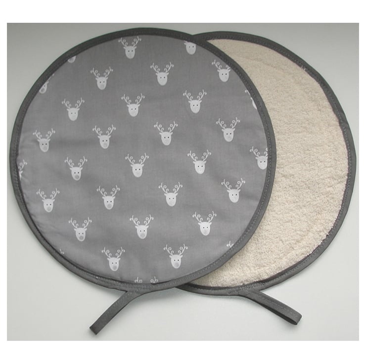 This mat has three layers - Facing cotton fabric, a layer of padding and a layer of towelling - Making it also suitable for mopping up and pot-grabbing!