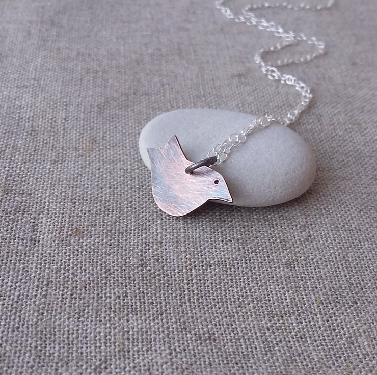 Cute little copper Christmas robin bird pendant. This folk art style bird pendant is handcut from sheet copper, filed, lightly polished then oxidised for a rustic look.