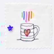This design has been made using freemotion and hand embroidery. A small piece of green silk has been chosen for the leaf, vein details have been picked out by machine embroidery, and the tiny ladybird has been hand stitched. This small brooch would make a beautiful accessory for a winter scarf or jumper.