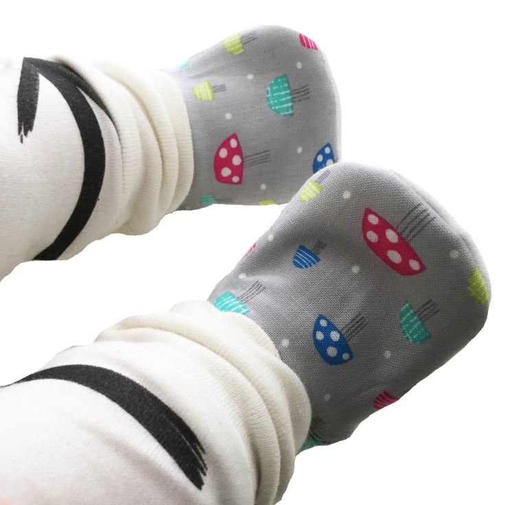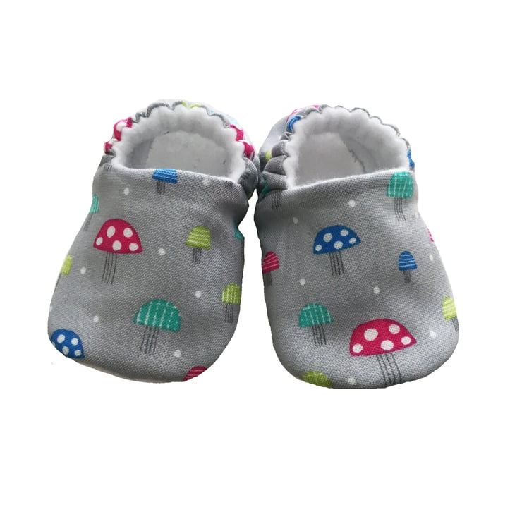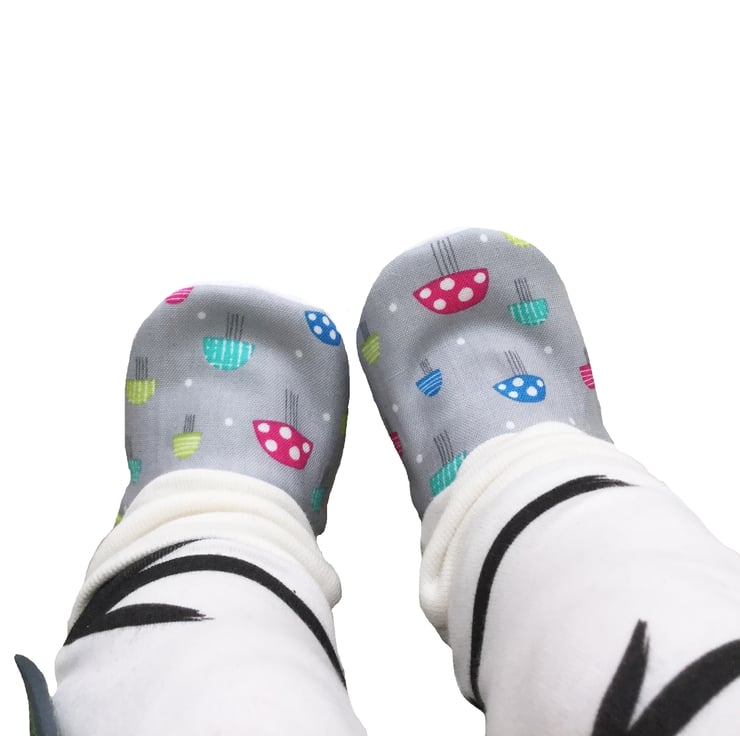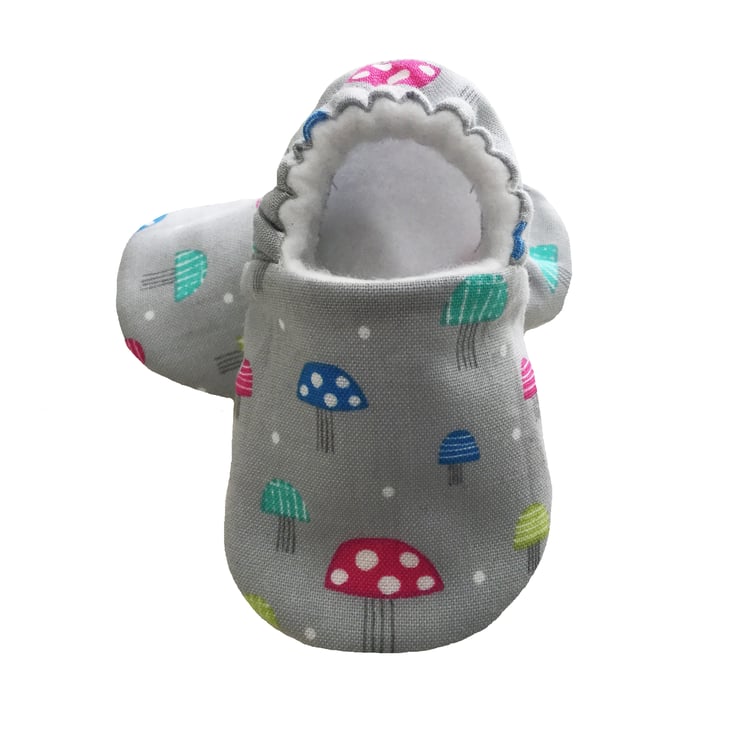 BABIES & KIDS SHOES in a cute multi TOADSTOOLS print on grey. (Also avail in pink). The Pram Shoes outer are made from 100% Cotton with a cosy fleece lining and elasticated heel - ensuring comfort for your little one.