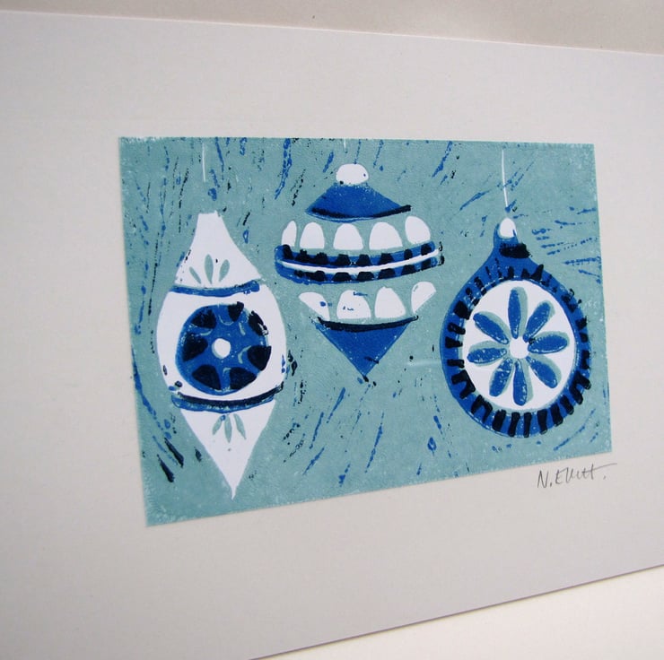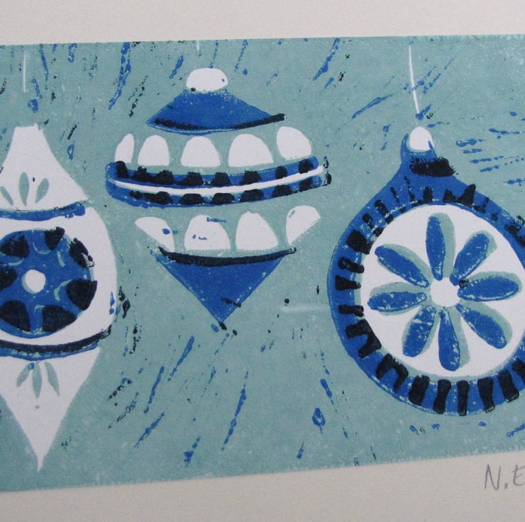 Small reduction lino print of three Christmas baubles. Printed in blues and greens on white and mounted on white board.