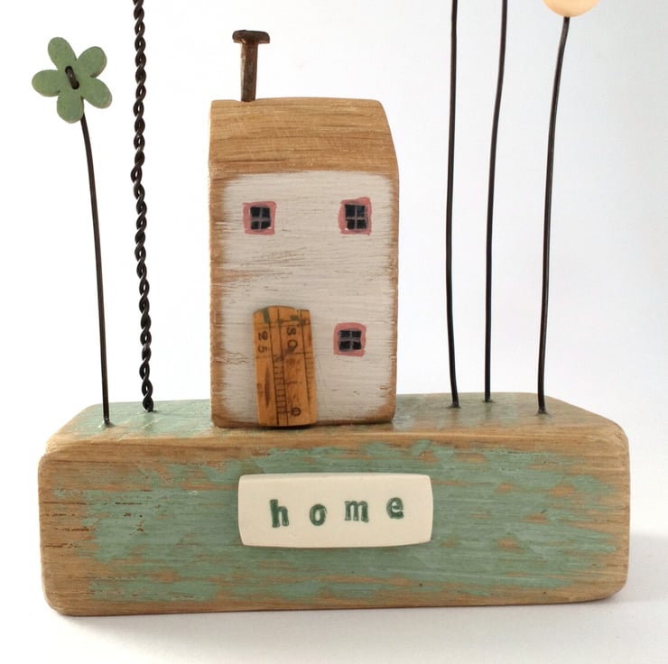 It sits on a sanded, painted and waxed oak wood block and on the front there is a clay plaque with the word 'home'.