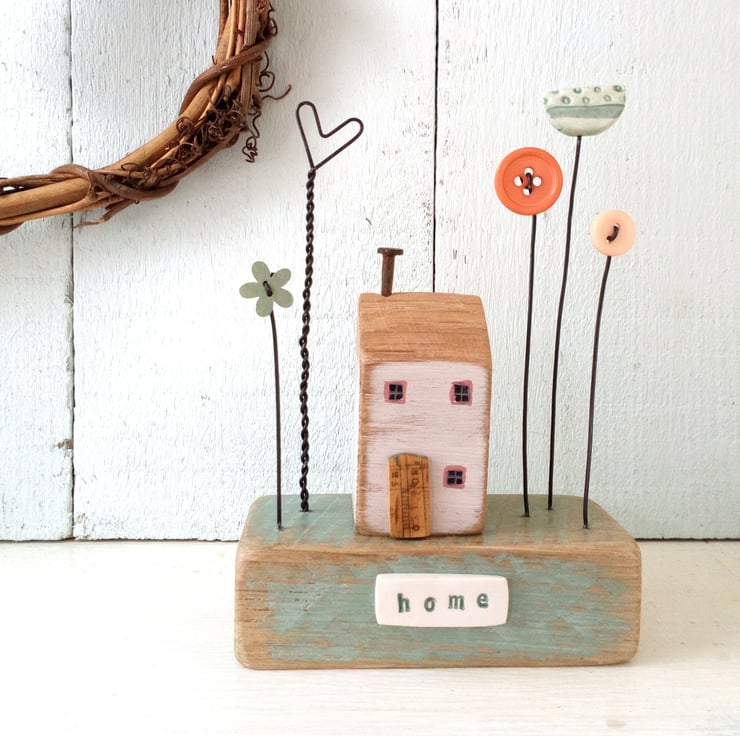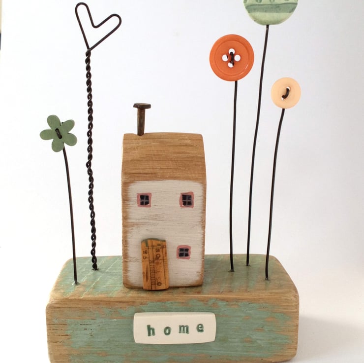 This little hand-painted oak wood house has a reclaimed wooden ruler piece for door and a garden of vintage buttons, a clay flower and a wire heart.