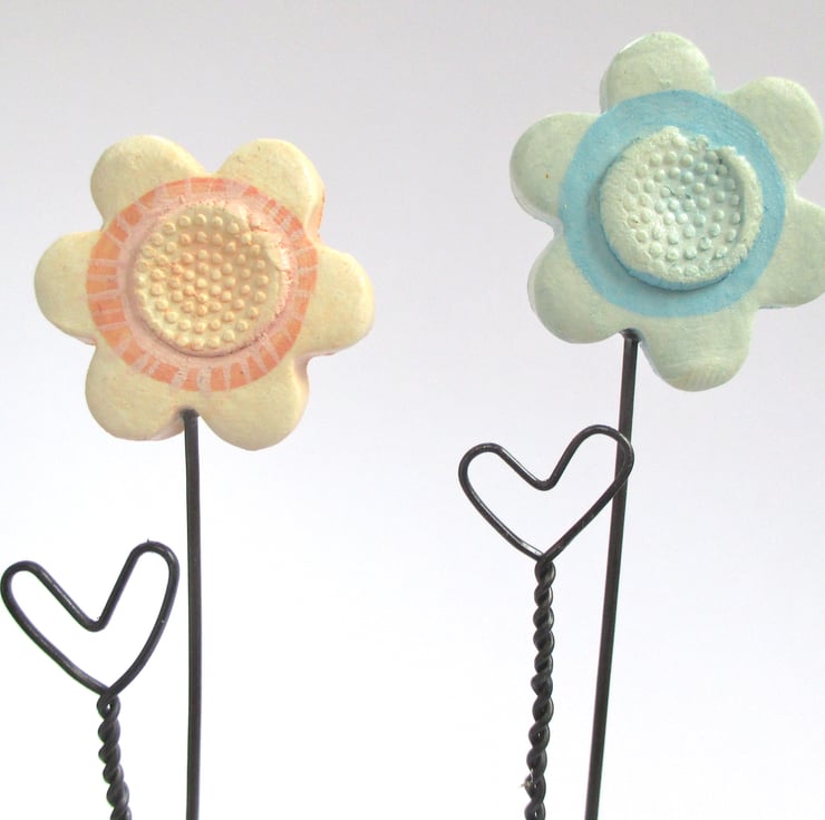 The flower is handmade from polymer clay. This is moulded and patterned, fired and hand painted and to finish.