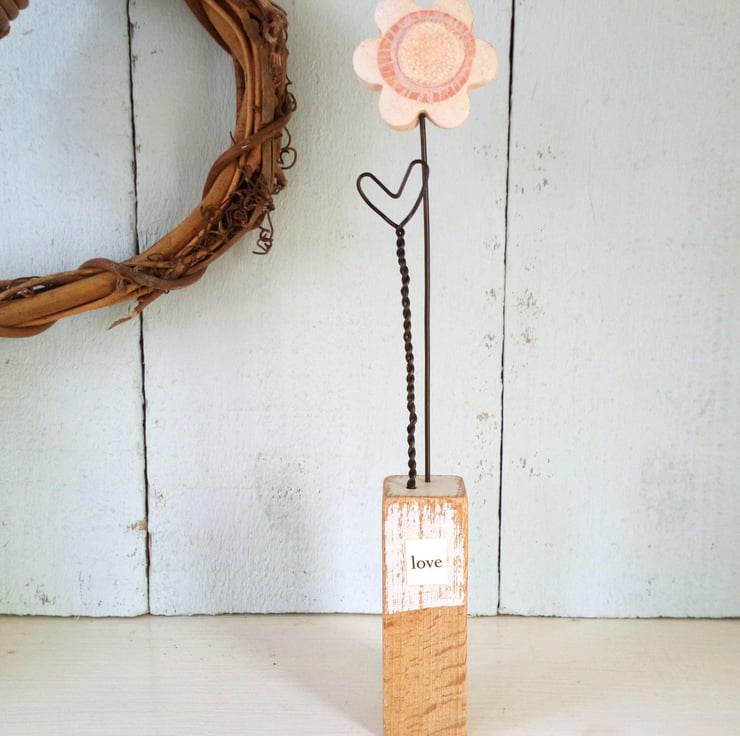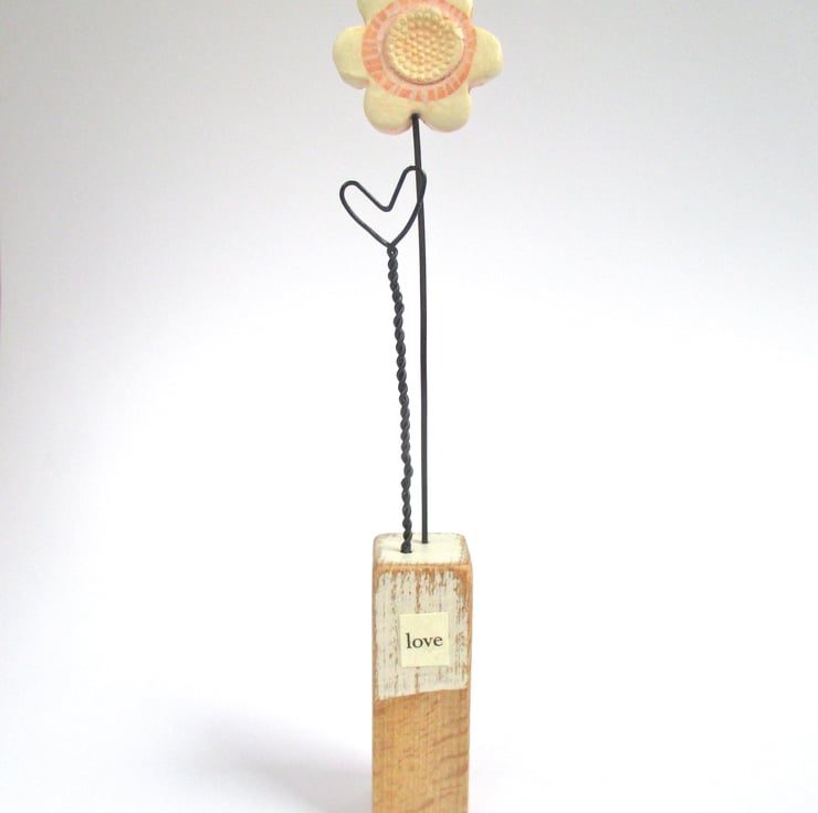 The little paper sign on the front has the word 'love' and watches over the sunny flower.