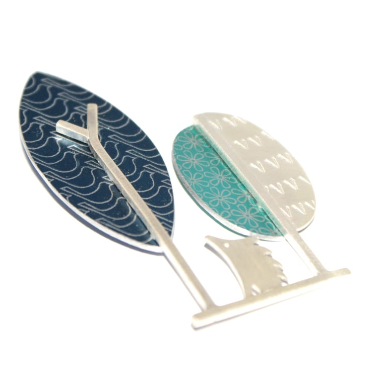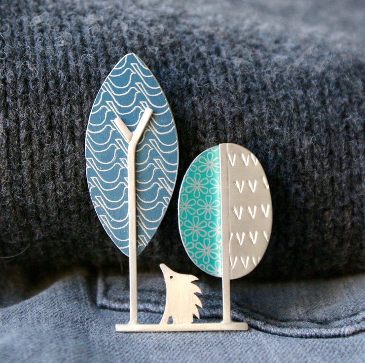 A cute brooch featuring 2 stylised trees and a little hedgehog hand crafted from sterling silver and aluminium. The framework is made from sterling silver square wire and silver sheet which has been textured with a zigzag shape. The coloured pieces are anodised aluminium which are blind riveted to the silver. The brooch pin is made from stainless steel as I find this provides more strength and holds it's shape. Please note your brooch may vary slightly from the image as each one is completely handmade.