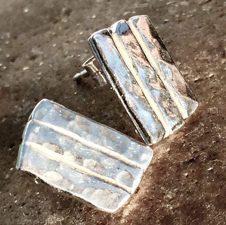These beautiful earrings are made from hand forged and hammered silver. They are designed to be irregular and are approx 11 x 7 mm.