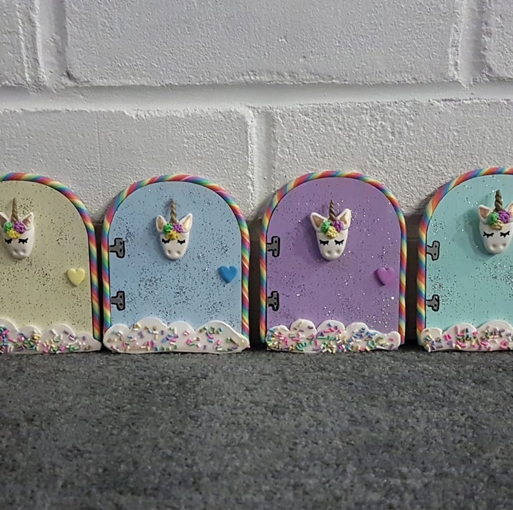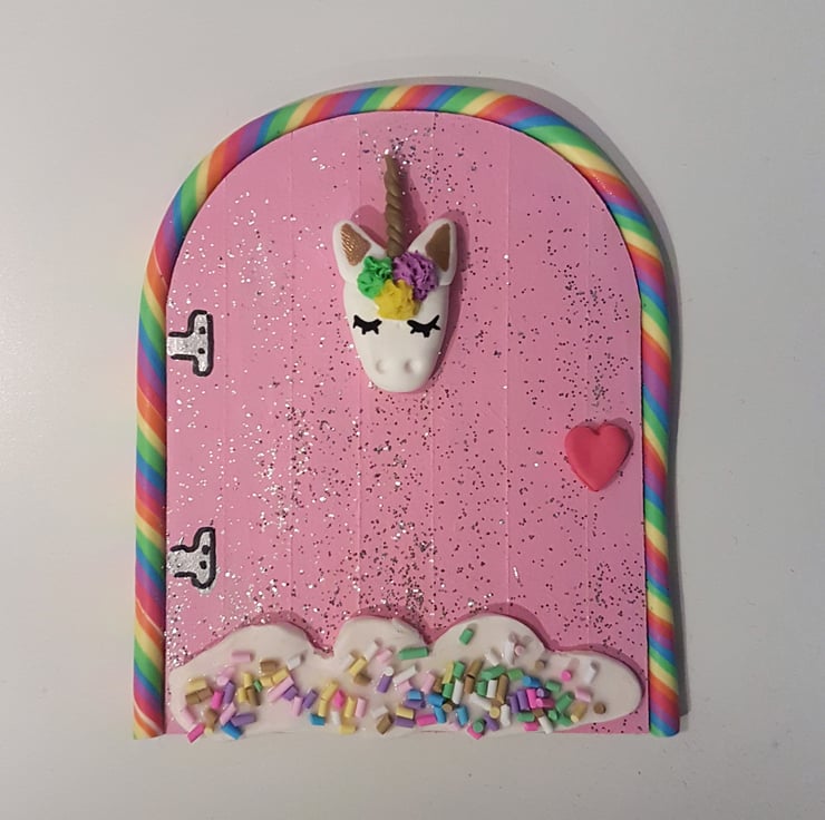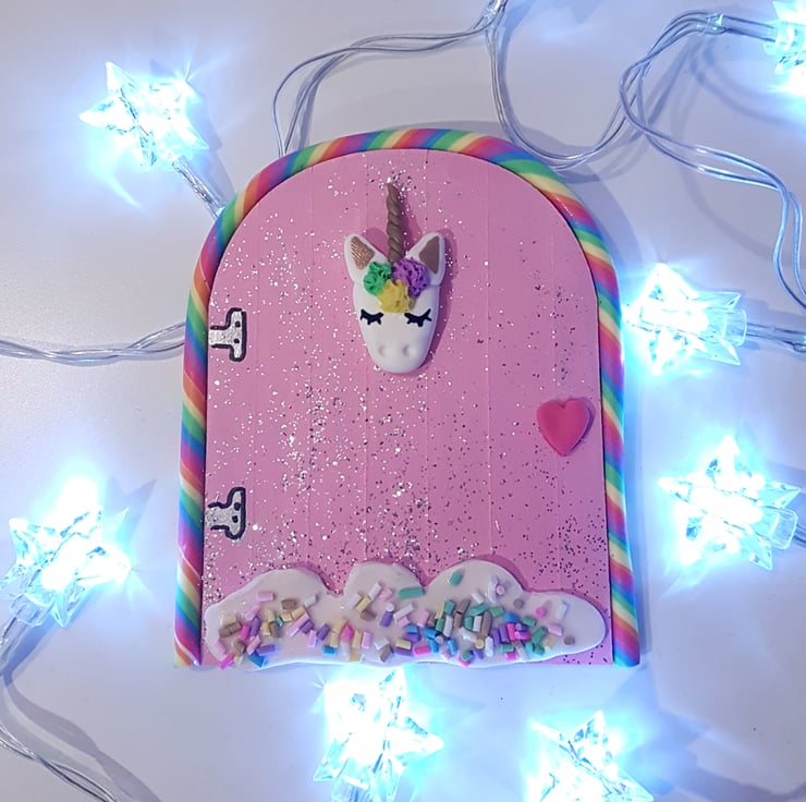 A gorgeous unicorn themed fairy door, painted with acrylic paint, sprinkled with glitter and finished off with some gorgeous polymer clay detail, including a rainbow archway round the edge, white clouds, heart door handle, rainbow coloured sprinkles and a cute unicorn face.
