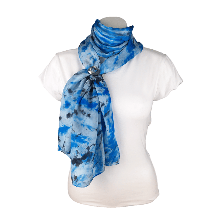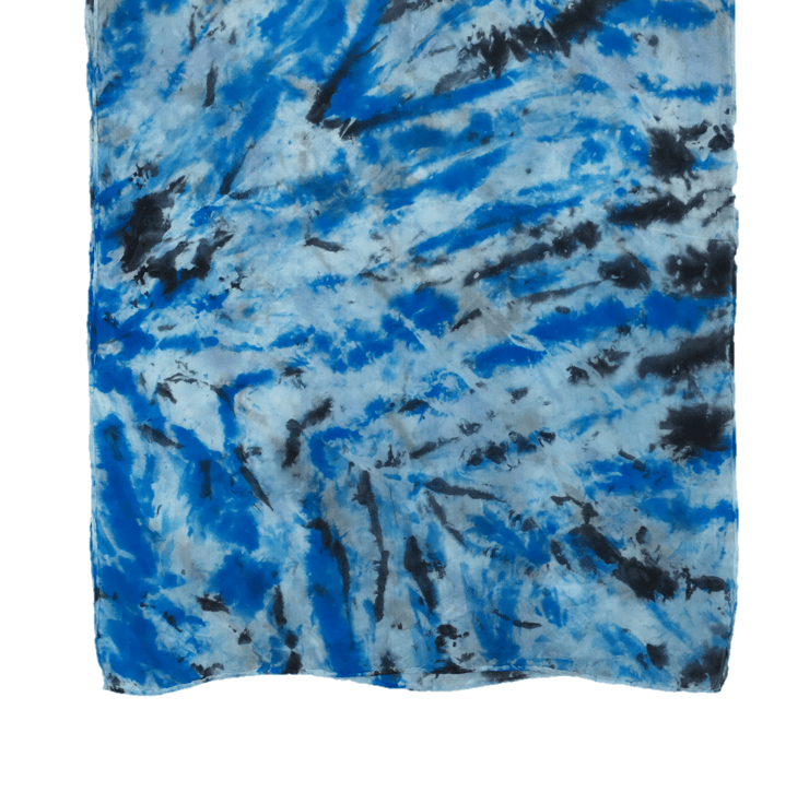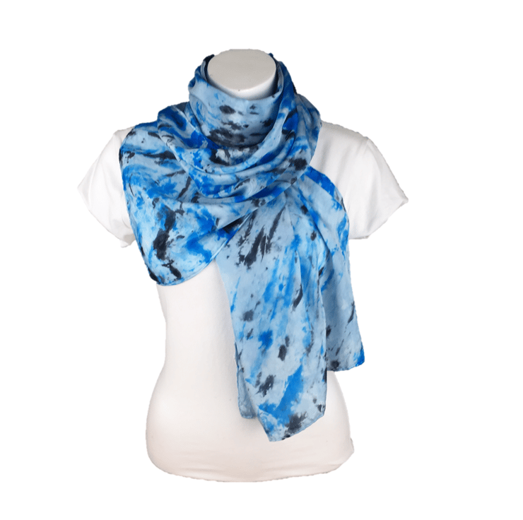 A gorgeous crepe de chine scarf has been dyed in a pale blue colour and then further dark blue and black dye has been applied in a random pattern. The crepe de chine has a beautiful drape to it and a lustrous surface sheen.