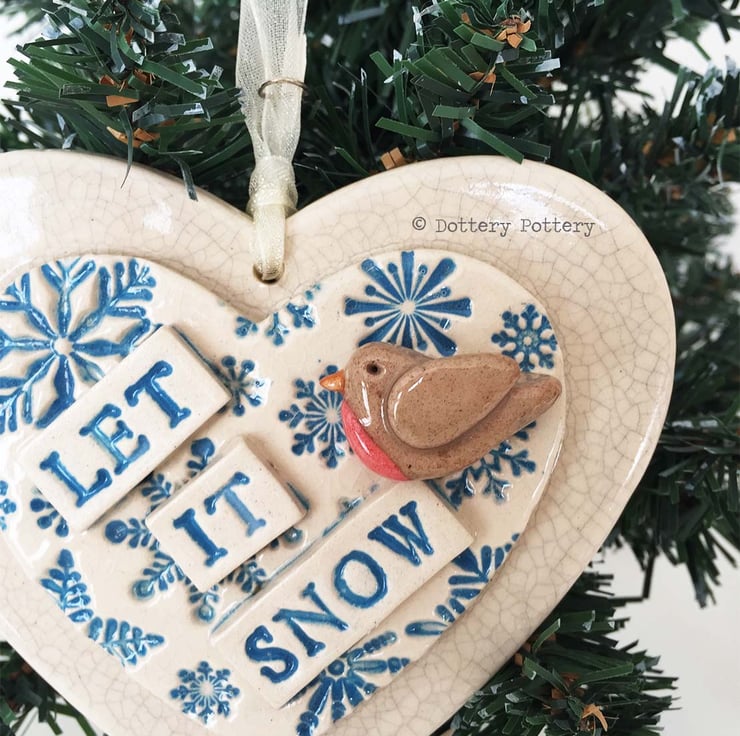 A little pottery robin sits upon the words Let It Snow.