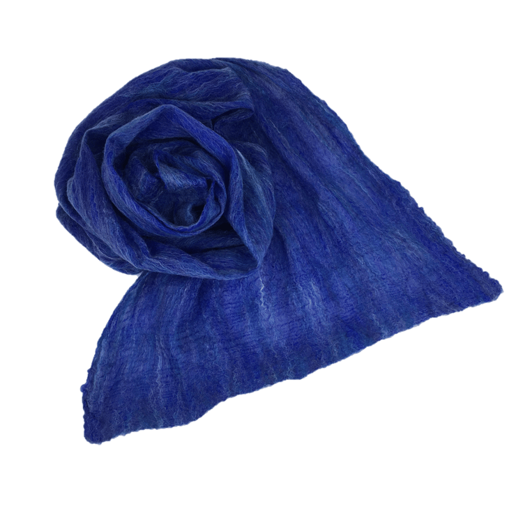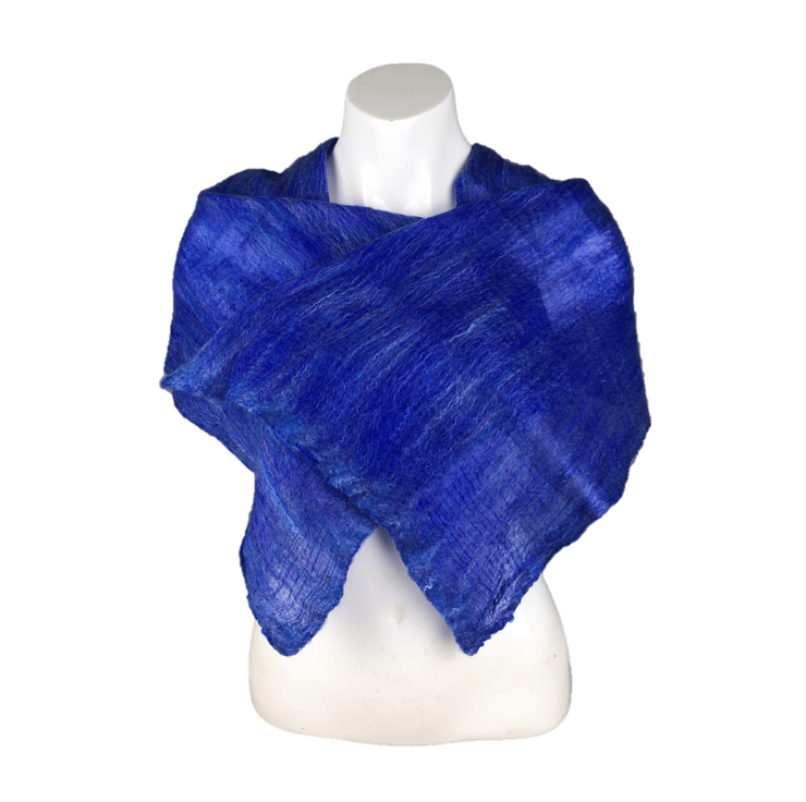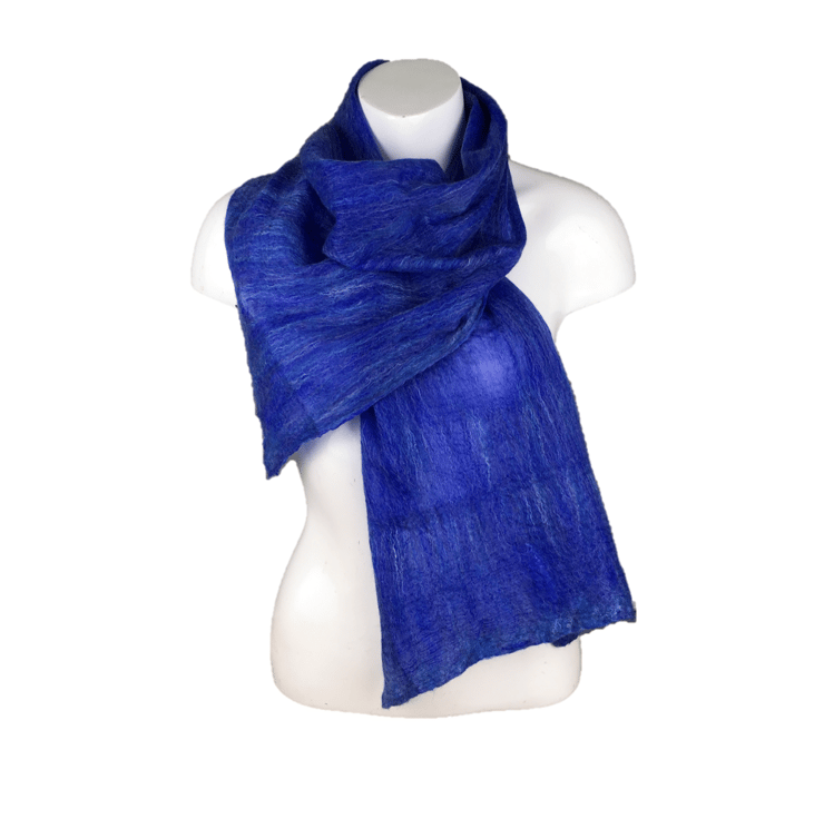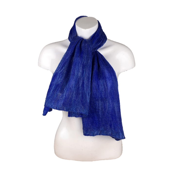 This gorgeously soft and lightweight scarf has been made using a nuno felting process. A blend of blue merino wool and bleached tussah silk fibres have been laid in a very fine layer over both sides of a dark blue silk chiffon base fabric and nuno felted. The nuno felting process causes the woollen fibres to migrate through the silk and bind with it to create a new fabric. The scarf is felted on both sides.