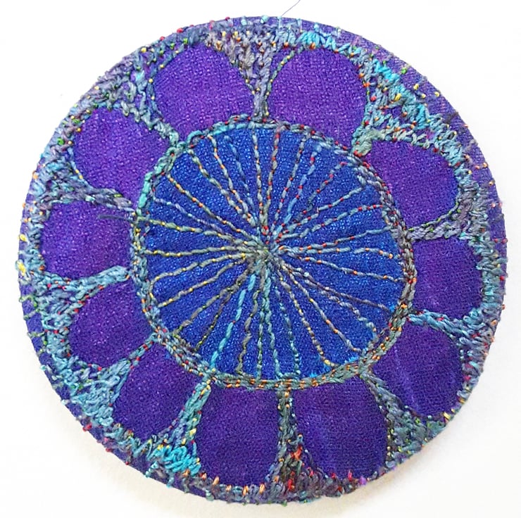 Made from layers of fabric including silk and hand dyed Egyptian cotton using the free machine embroidery style of sewing