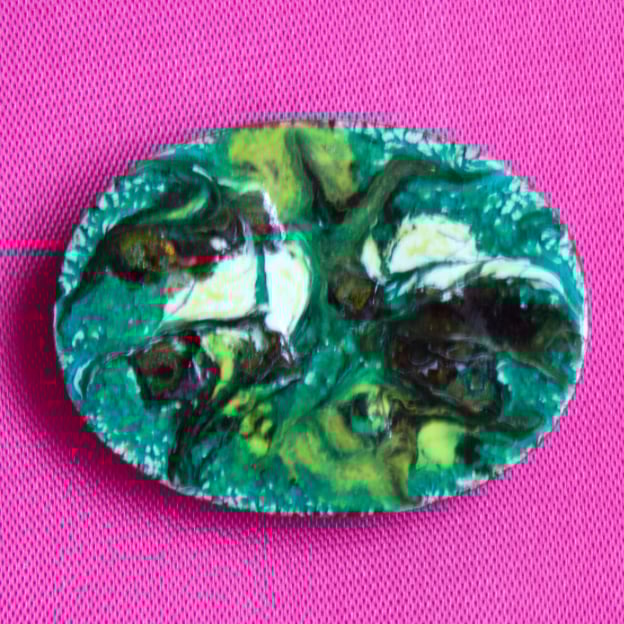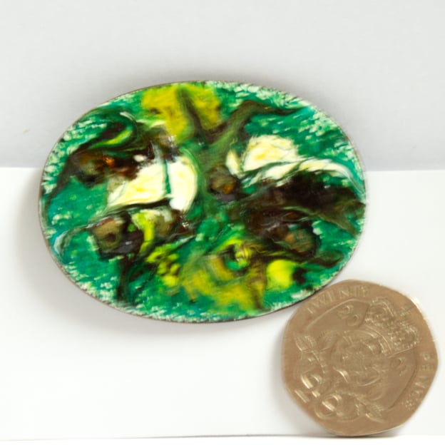 On a layer of green fired over a base of white are scatterings of brown, white and gold scrolled into a design. Small squares of copper glint, golden-brown, adding a pleasing variation to the colours of the brooch.
