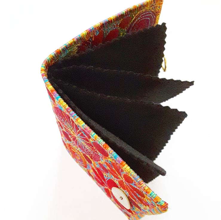 It has 4 leaves of black felt for all your pins and needles and a beautiful mother of pearl button and an elasticated closure.