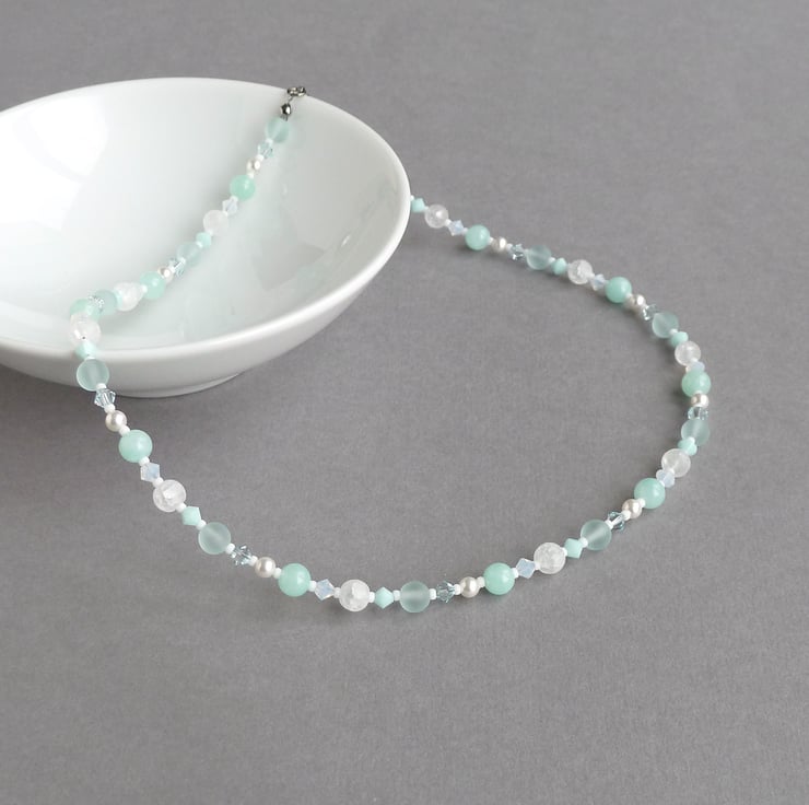 I have used rock crystal, jade, sea glass, Swarovski crystals and Swarovski pearls to create this aqua coloured necklace. The combination of different hues and finishes used increases the necklace's versatility.