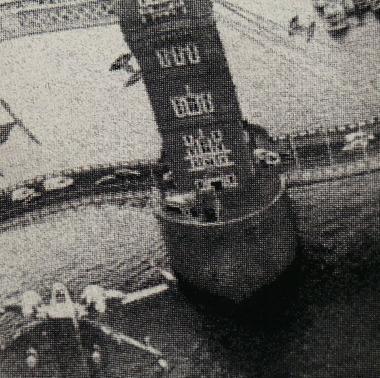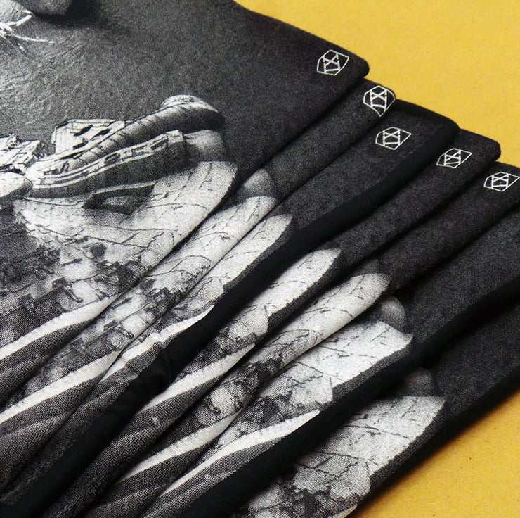 A single colour halftone screen print, white on navy blue 100% cotton T shirts. Hands screen printed in Bristol.