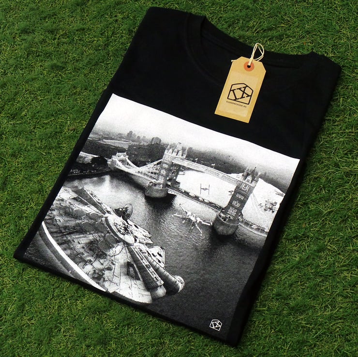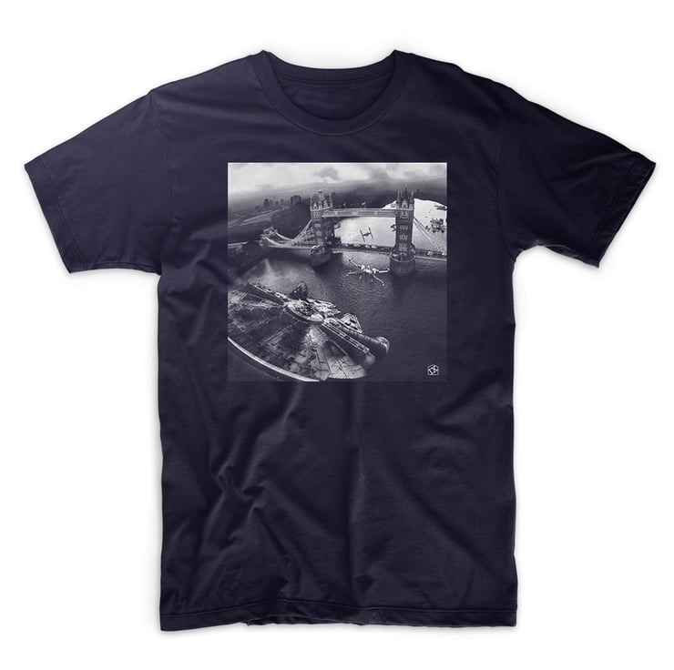 Star Wars meets London Tower Bridge over the River Thames is the third Star wars art installment between uchi clothing and IX T shirts. Imaginatively titled 'Star Wars vs London - Incident at Tower Bridge'.