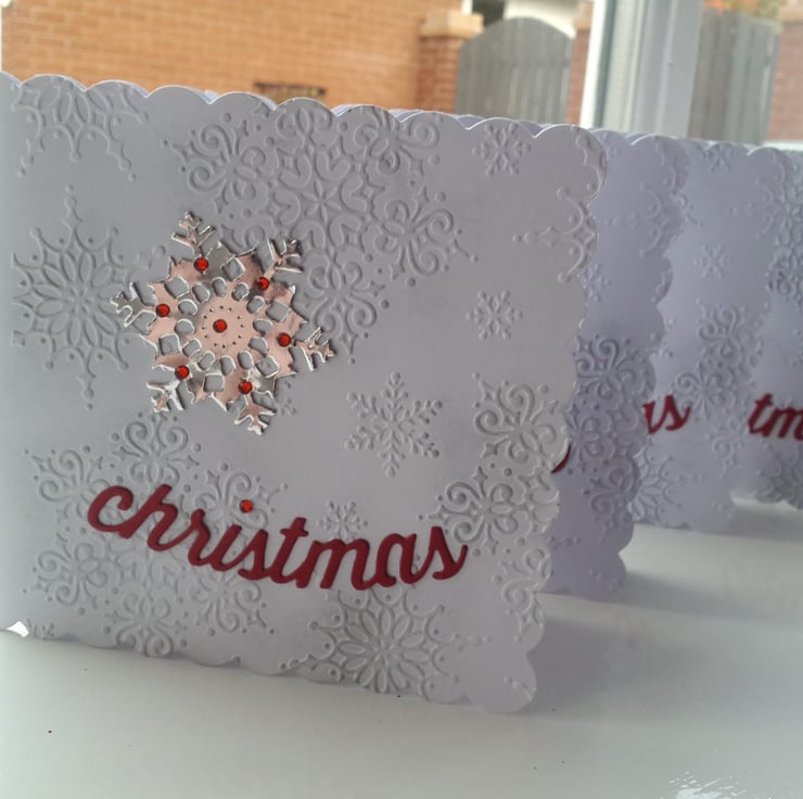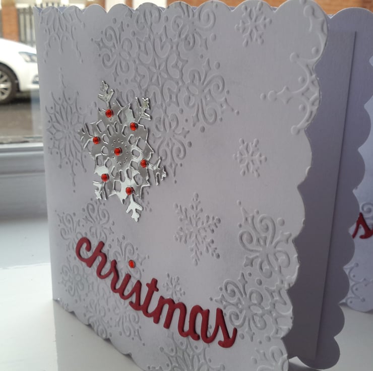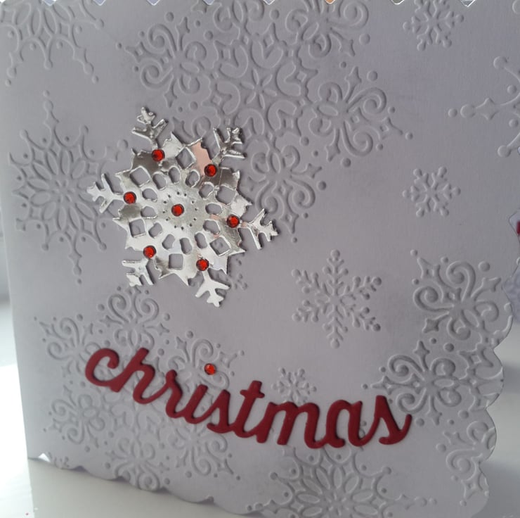A completely handmade and uniquely designed pack of 4 cards all the same design. Consisting of quality pristine white card with a scalloped edge which has been embossed with a pretty snowflake design. A snowflake has been die cut from silver mirri card and embossed with rec rhinestones. Finished off with Christmas die cut from rec card.
