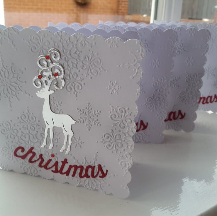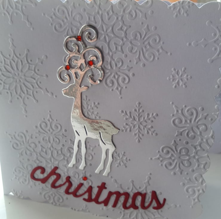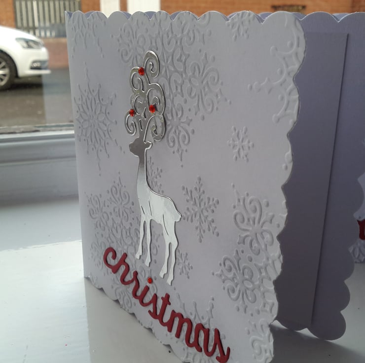 Completely handmade and uniquely designed pack of 4 same design cards. Consisting of quality pristine white card which has been embossed with a pretty snowflake design. A reindeer has been diecut from silver mirri card and embellished with red rhinestones on his handsome antlers. Finished off with Christmas die cut from rec card